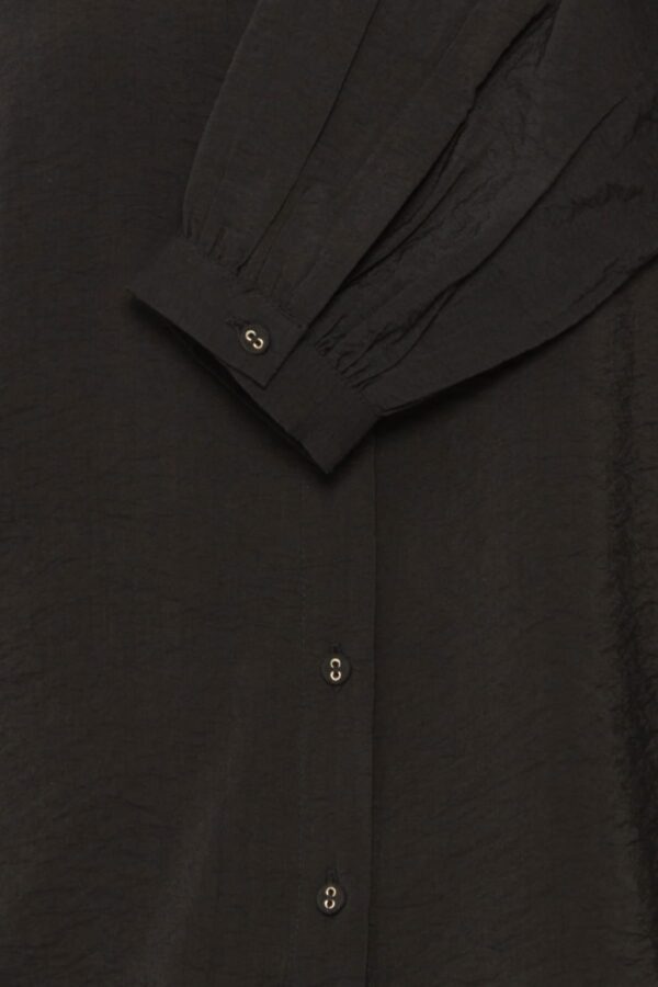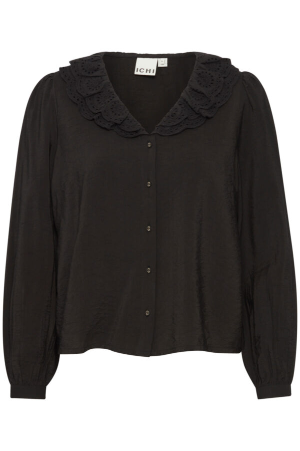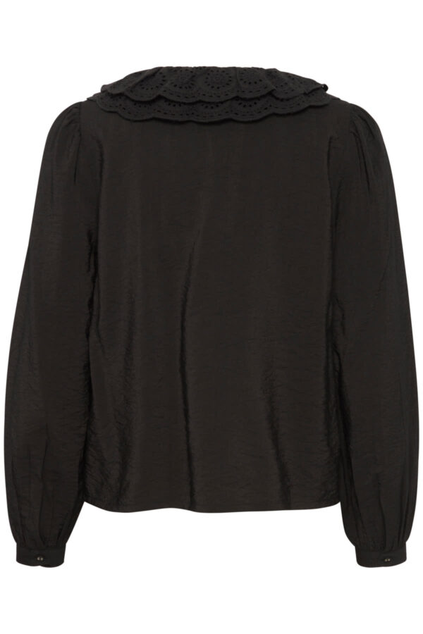 This black shirt features a very elegant embroidered frill collar with a round neck. It has a button down front with a button fastening on each cuff. A simple yet stylish shirt that can be worn with jeans, trousers or a skirt.