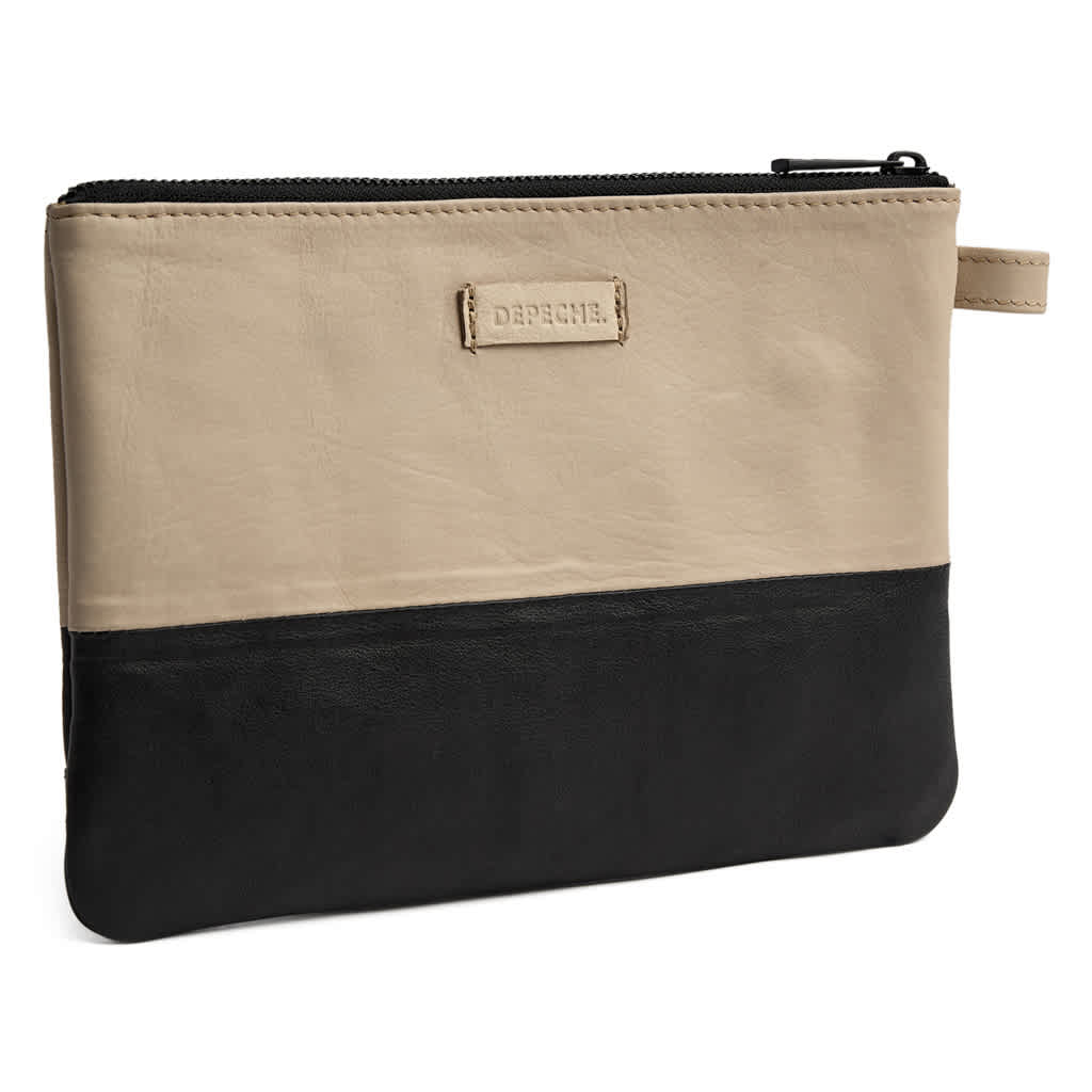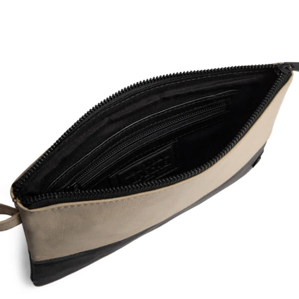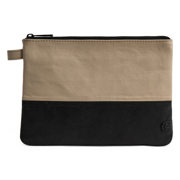 This trendy clutch is ideal for everyday and evenings where you want to add a trendy element to your outfit. It features a two-tone colour with a classic black on the bottom and a warm vanilla shade on the top. This bag securely closes with a black matte zip at the top adding a minimalist touch. Perfect for storing your essentials while still being lightweight and practical to carry.