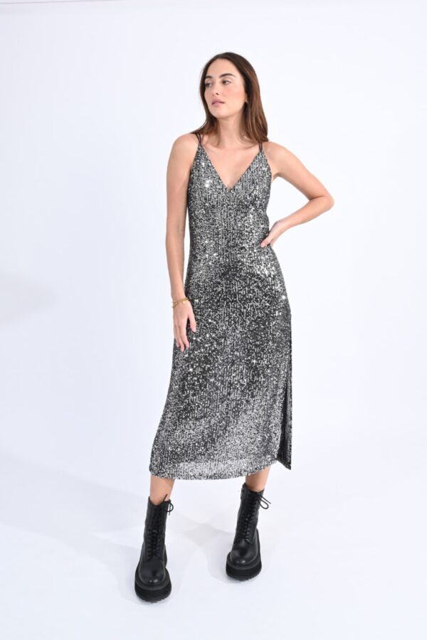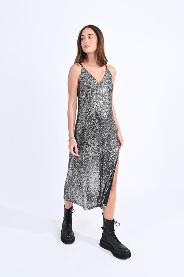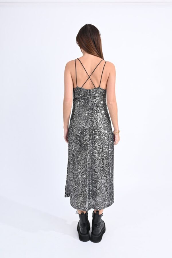 Long sequin dress, slit on one side and thin straps crossed in the back. Perfect for the festive party season.