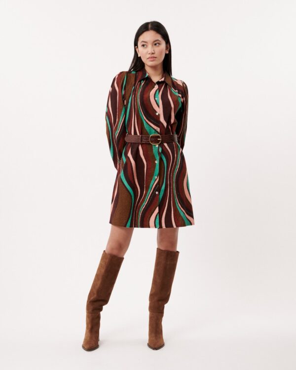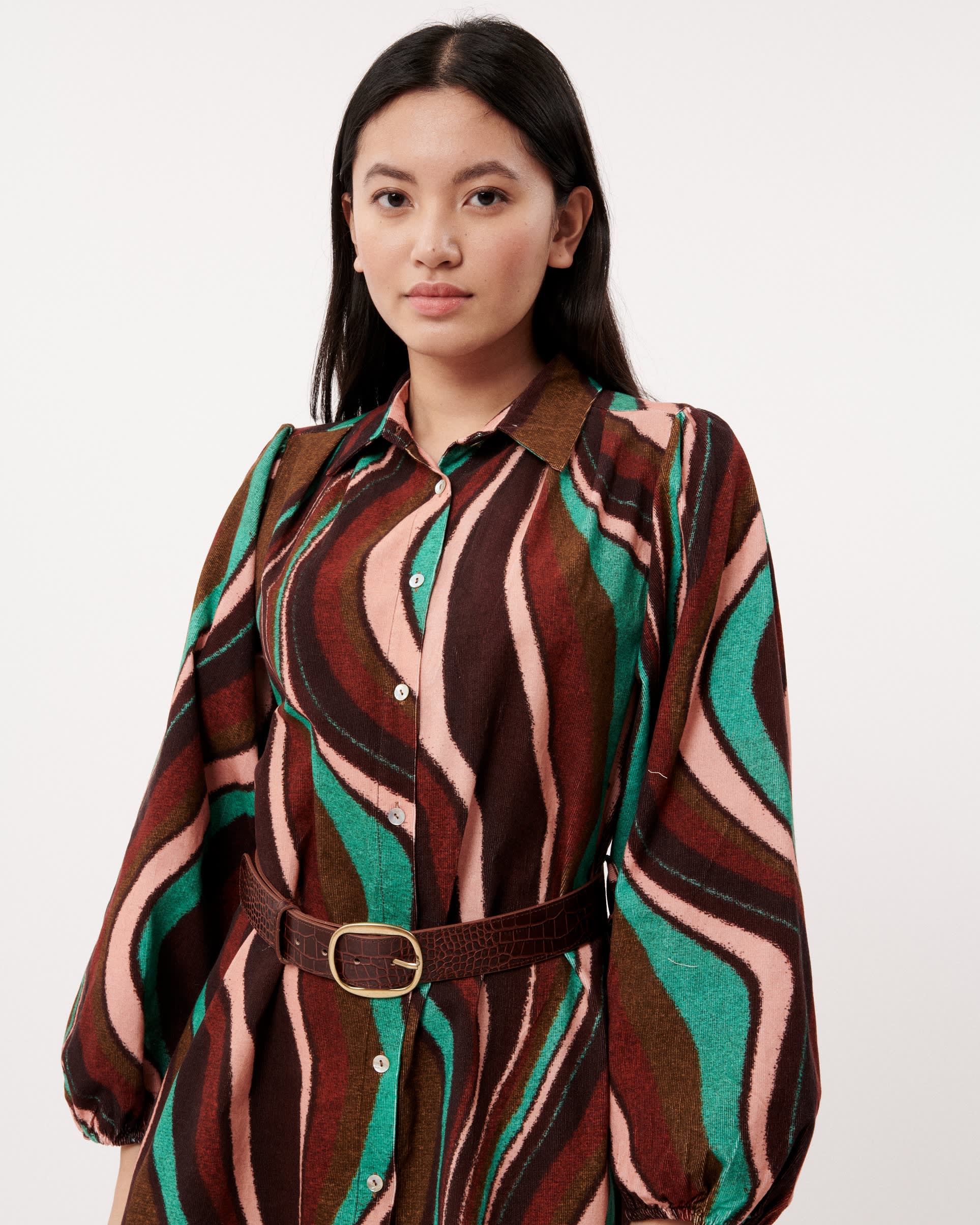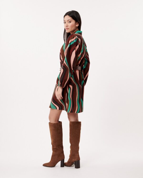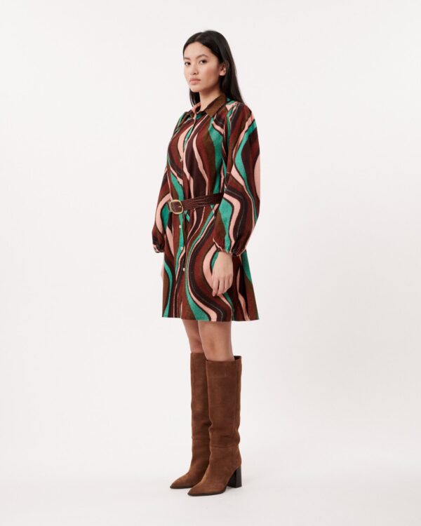 We love the colours in this beautiful corduroy shirt dress. It has long balloon style sleeves and a beautiful swirl pattern with a belt to nip you in at the waist. Wear this with a pair of brown boots. NOTE: Belt pictured not included, a matching fabric belt is included. Similar belts can be found here.
