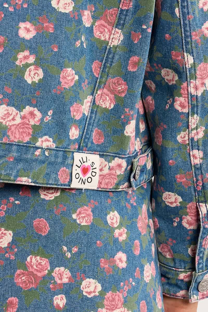 Denim crop jacket with super cool rose pattern. Long sleeves, buttoned cuffs,Officer Collar.