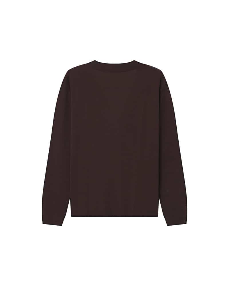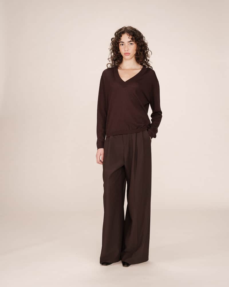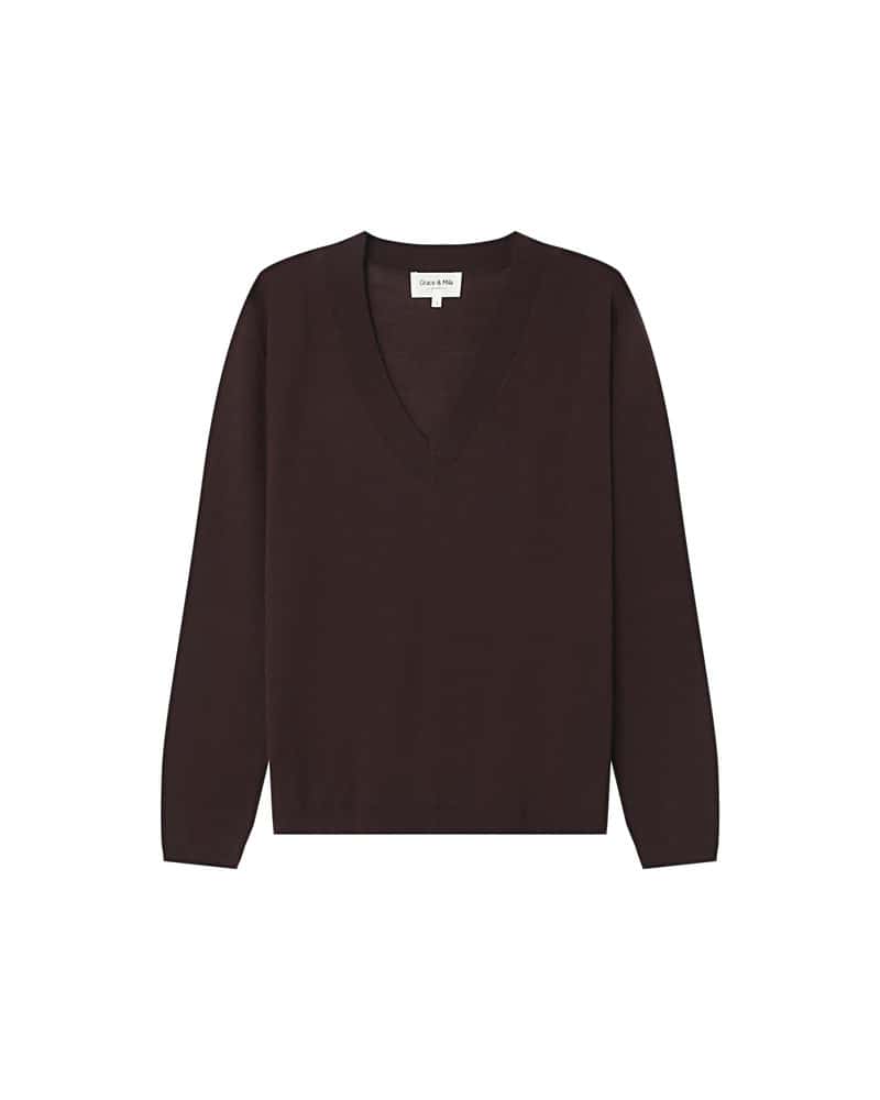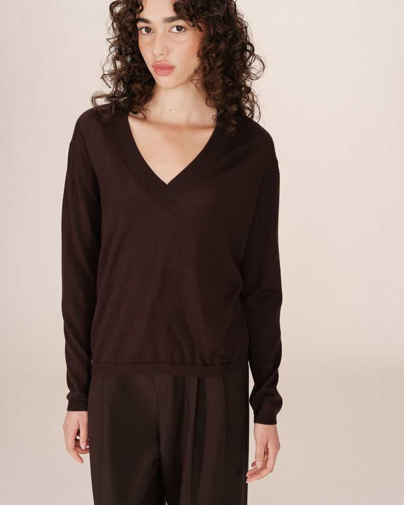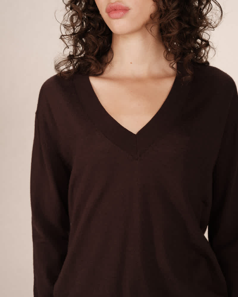 This fine knit sweater is made from 100% merino wool. It is a loose fit, has long sleeves and has a deep V-neckline.