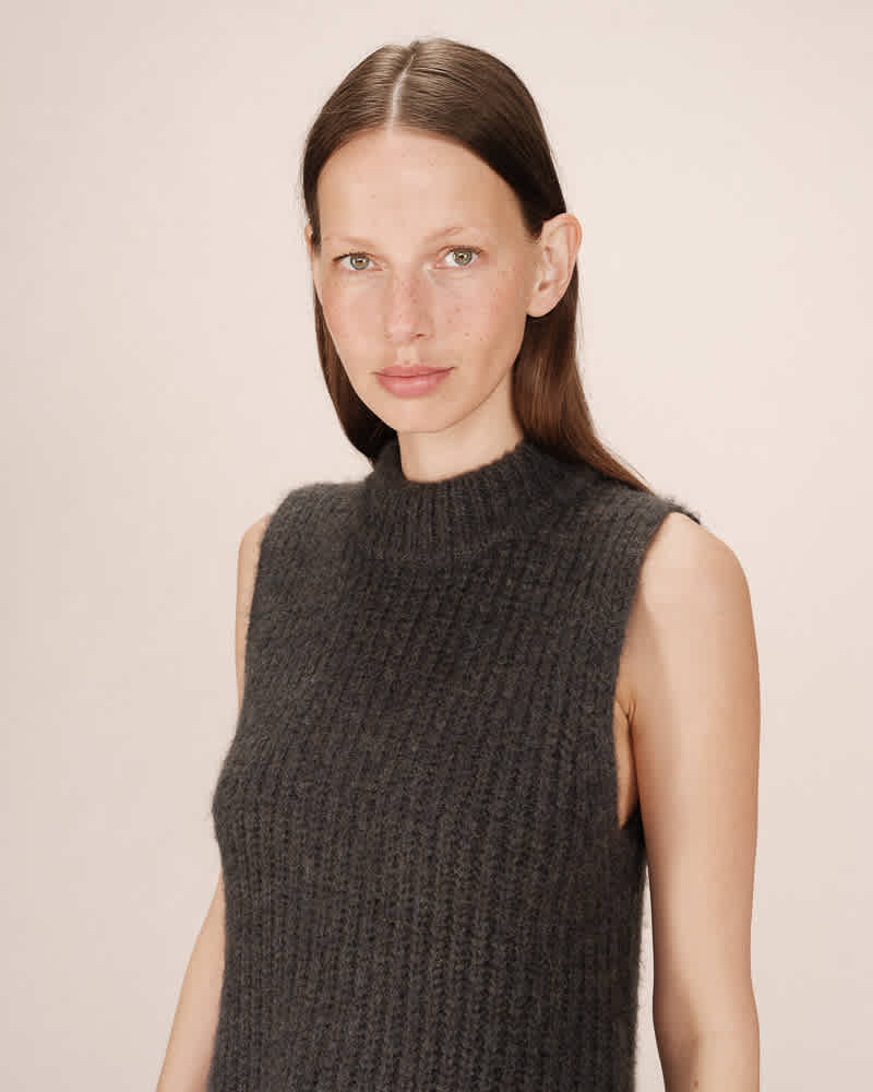 This knitted wool and alpaca sweater features a pearl textured neckline and a clean, straight cut. The high neck and side slits add a graphic, structured touch. Inspired by an urban, minimalist wardrobe this knit creates a modern and confident silhoette. Wear with a wide leg jean for a relaxed and timeless look.