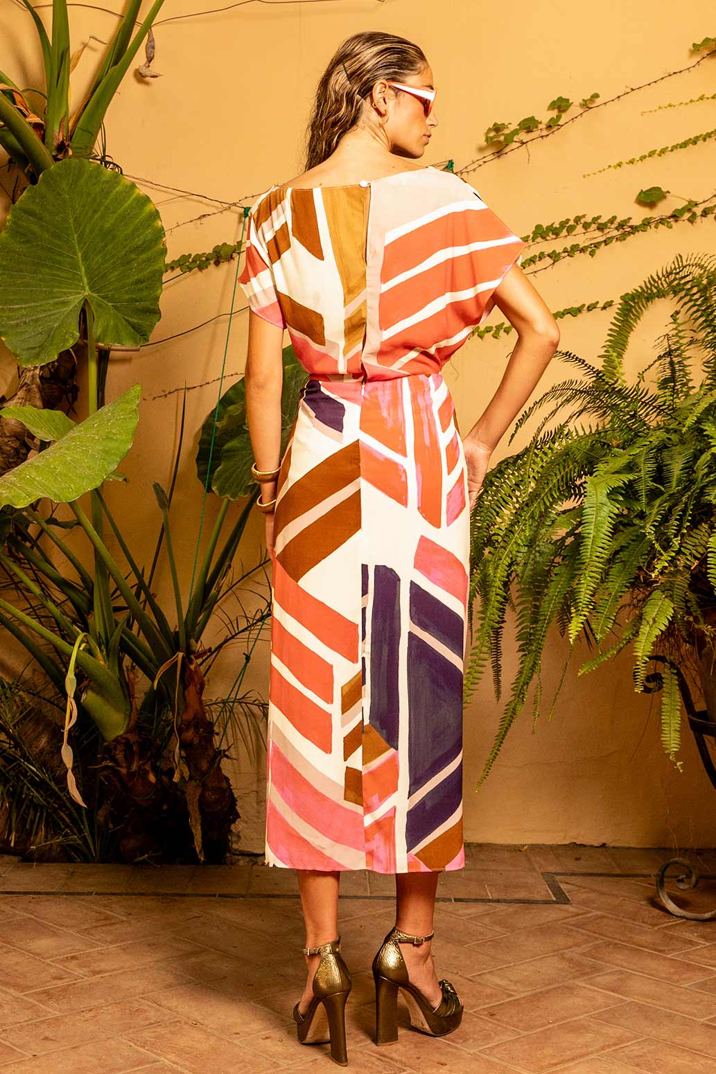 This short sleeved dress is midi length and features a knotted overskirt to flatter the waist. It has a button to close at the back of the neck and displays a glimpse of the upper and lower back. We adore the multi colour print and the relaxed neckline on this dress. Perfect for any summer occassion. Wear with a block heel tan sandal to compliment the colours throughout.