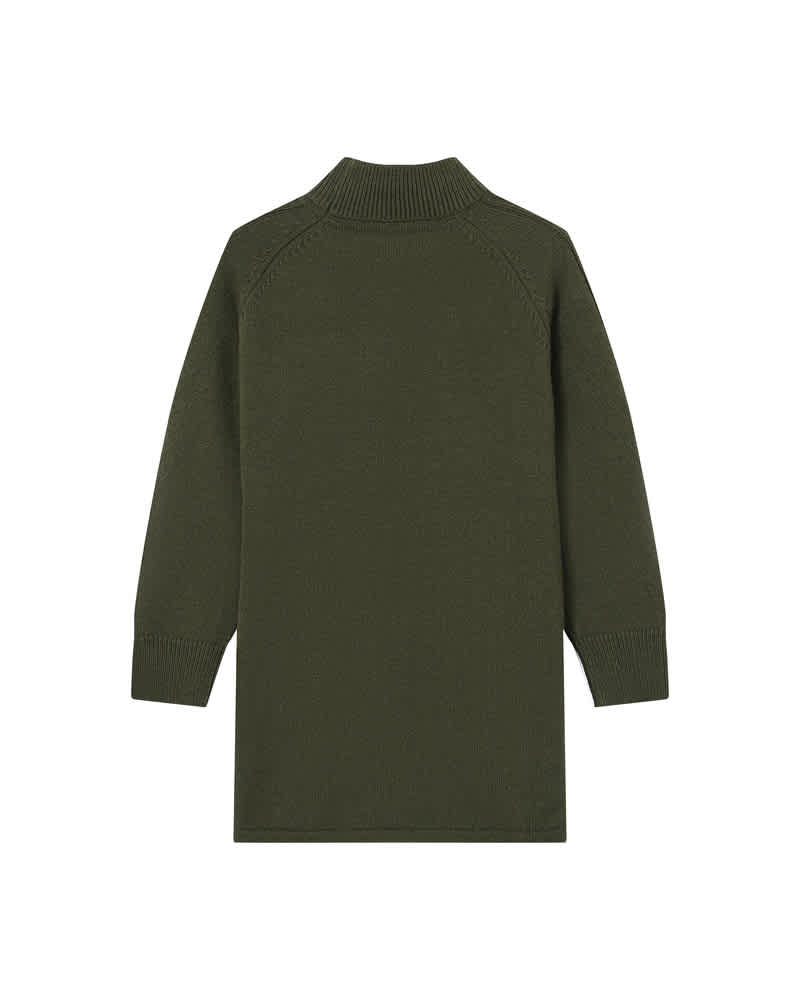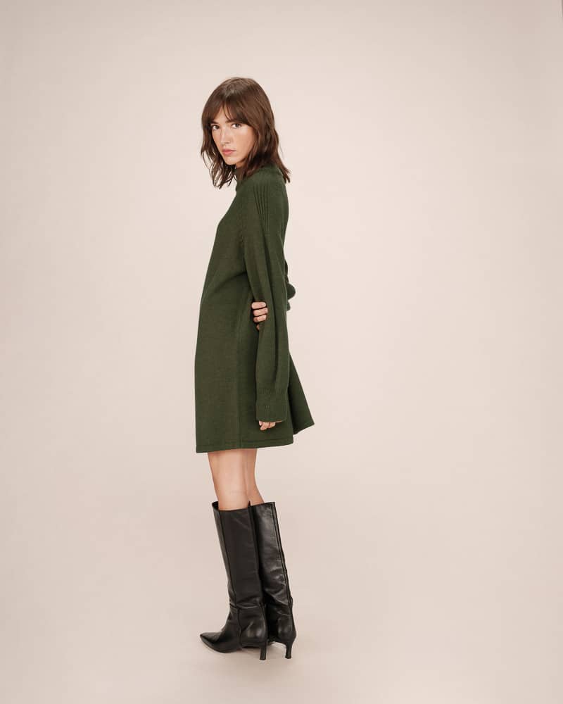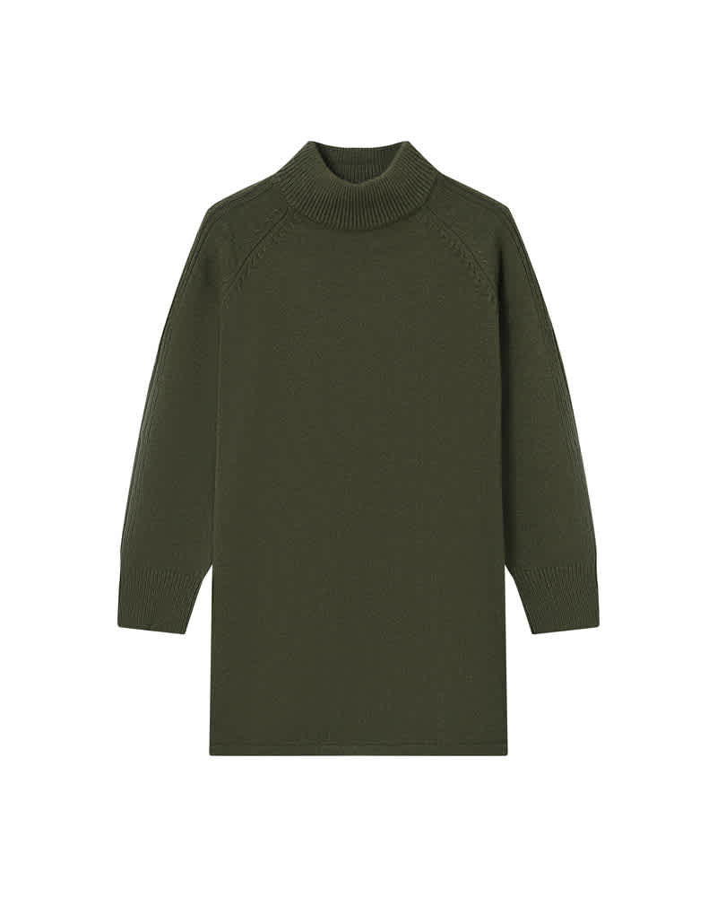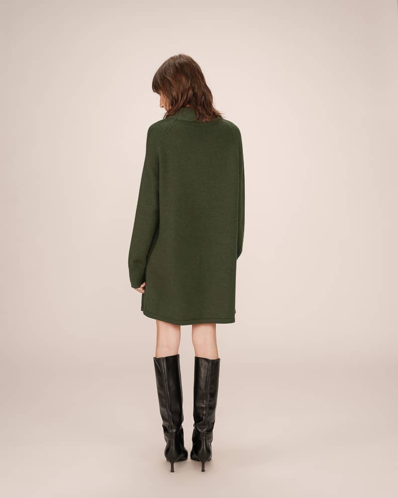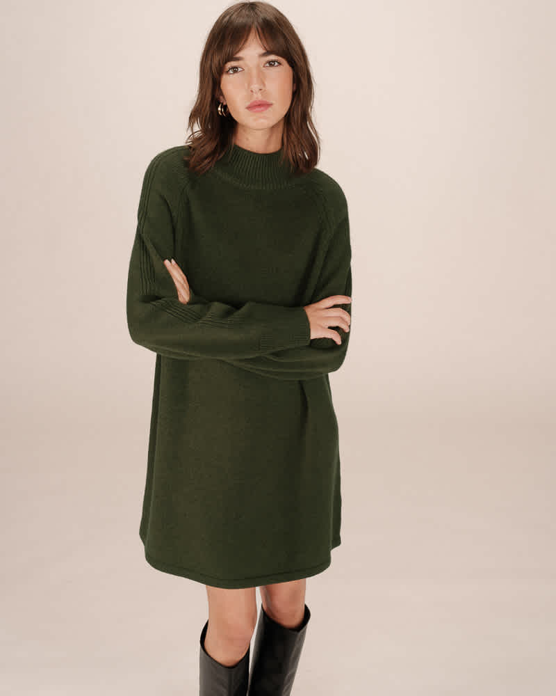 This short wool blend jumper dress in khaki is warm and comfortable making this a perfect addition to your Winter wardrobe. Its timeless A-line cut and high neck evoke a revisited retro style, while the raglan sleeves and knit detailing add a modern touch.This is a must-have piece for creating a chic and relaxed silhouette. Wear with tights and boots.