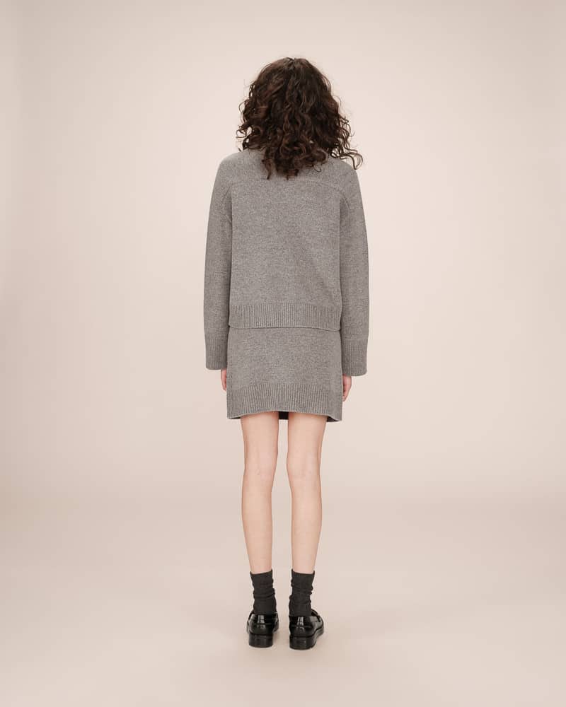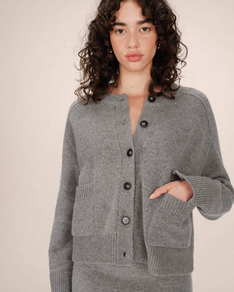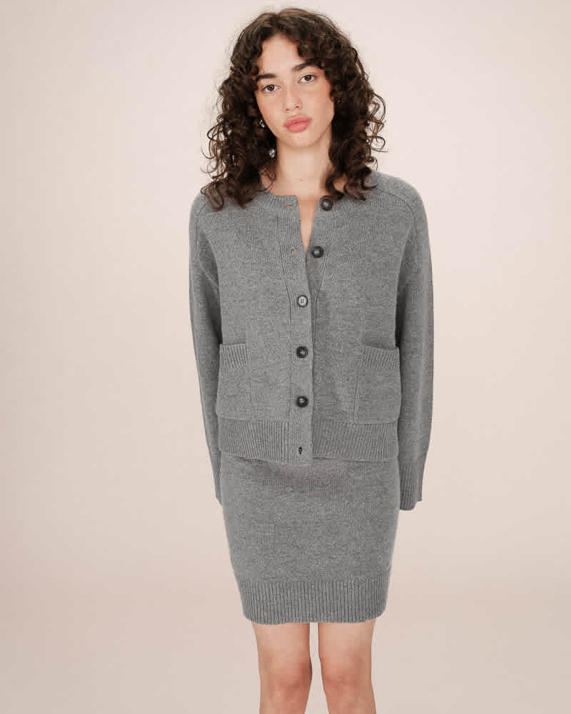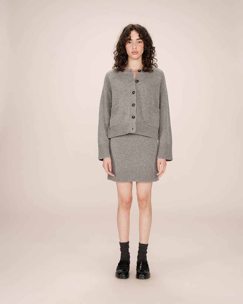 This oversized wool cardigan features buttons down the front creating a clean and elegant silhouette. Made from a wool blend yarn, it’s a warm essential and a must-have for the season. We love the two pockets to the front and the simple round neckline. The sleeves are long with hammer armholes and it has ribbed finishes on the neckine,cuffs, and hem. Wear with Shae Mini Skirt Grey and boots.