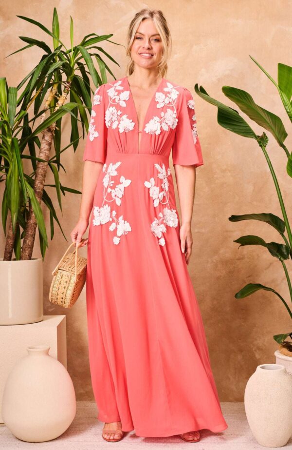 Plunge Front Embellished Maxi Dress With Flutter Sleeve
