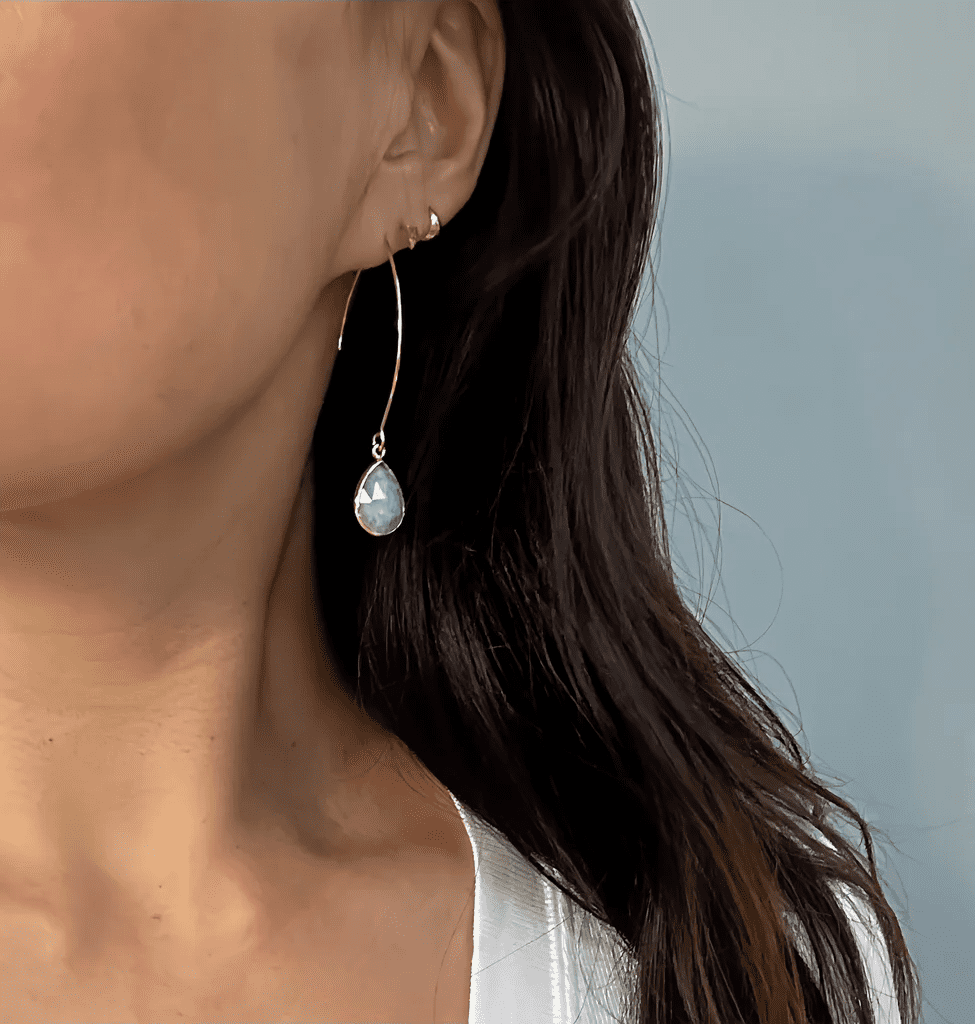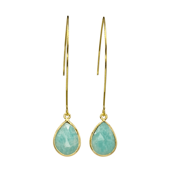 Seafoam earrings are handcrafted with faceted amazonite stones set in 14 karat gold plated brass and matte 16k gold plated hook wires.