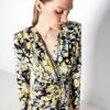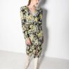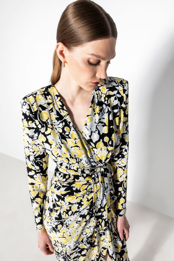 V neck dress with a yellow and blue floral print through out. V neckline and padded shoulders giving shape. A line skirt with ruche centre panel creating a flattering fall to the dres. Matching fabric belt with gold buckle. Long sleeved and small slit in the front of the skirt. Fully Lined