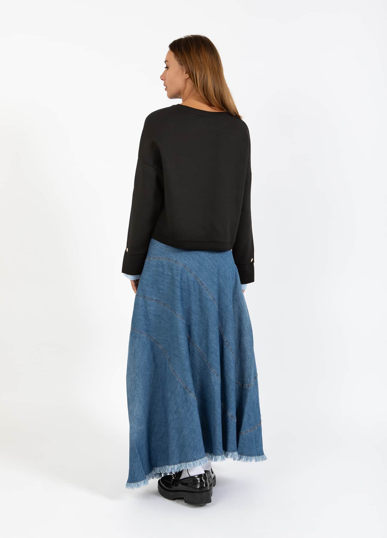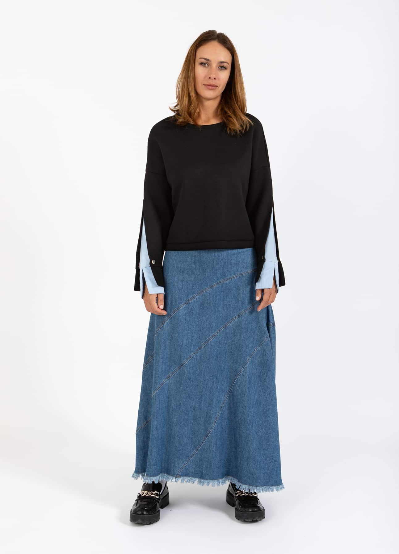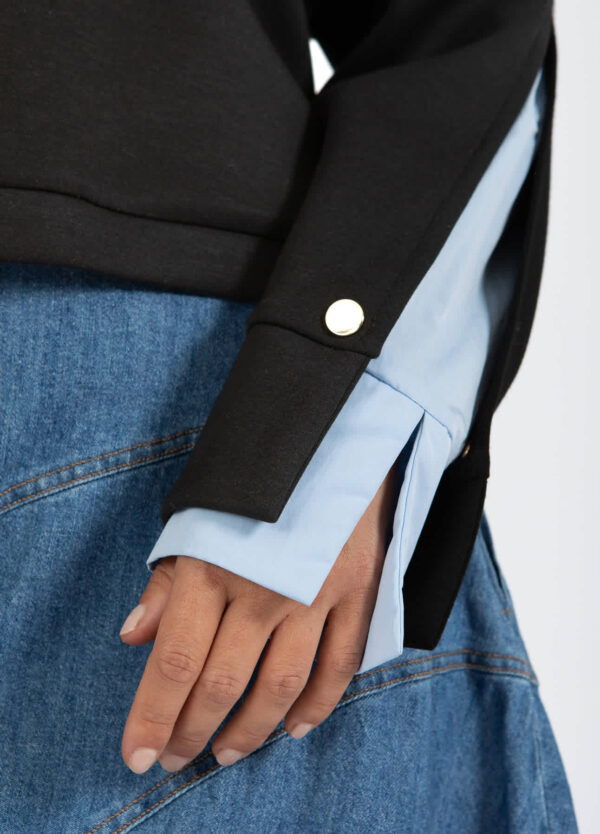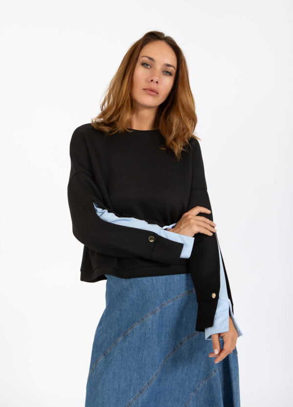 Super soft black sweatshirt with striking sleeve detail. The sweatshirt sleeve opens at the seam to reveal a blue shirt sleeve underneath. Both sleevels are held together with a gold popper at the cuff.