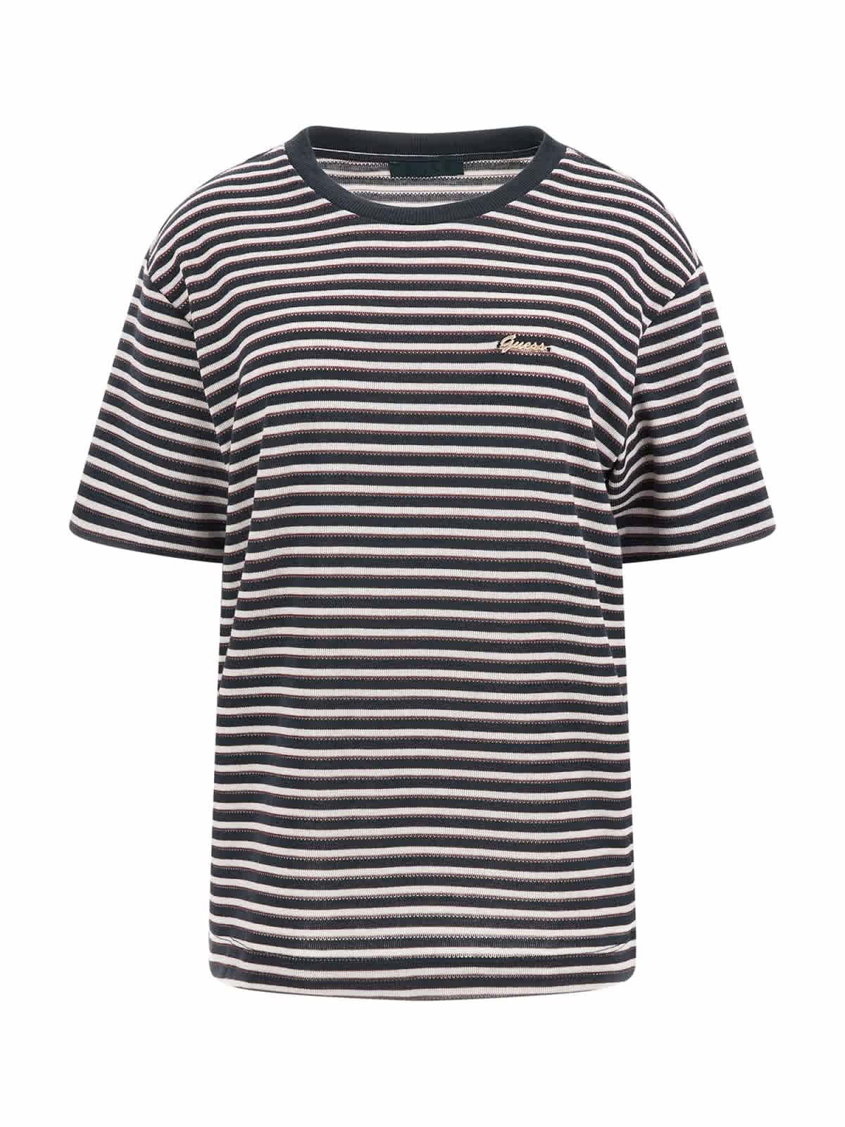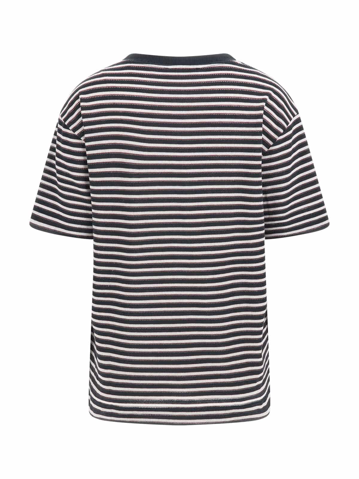 Another classic to add the capsule wardrobe. Round neck stripe tee in a dark grey, burgundy & white stripe.