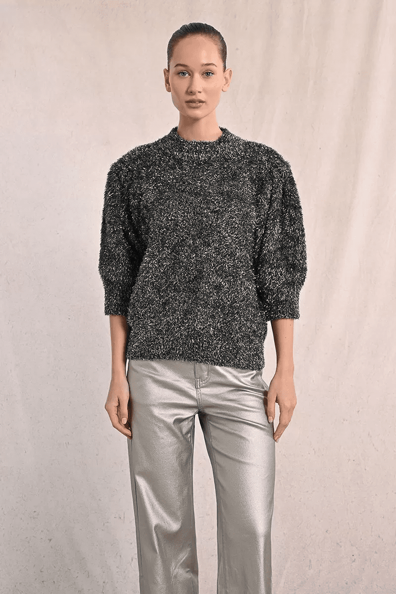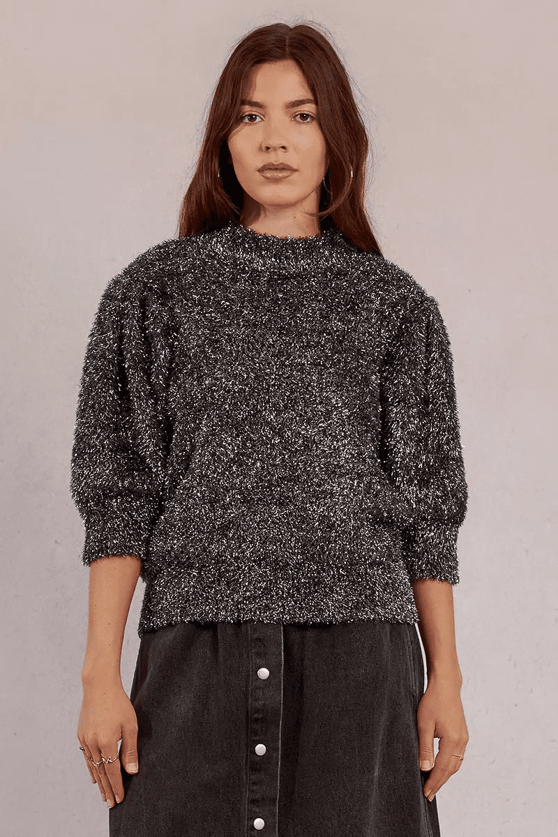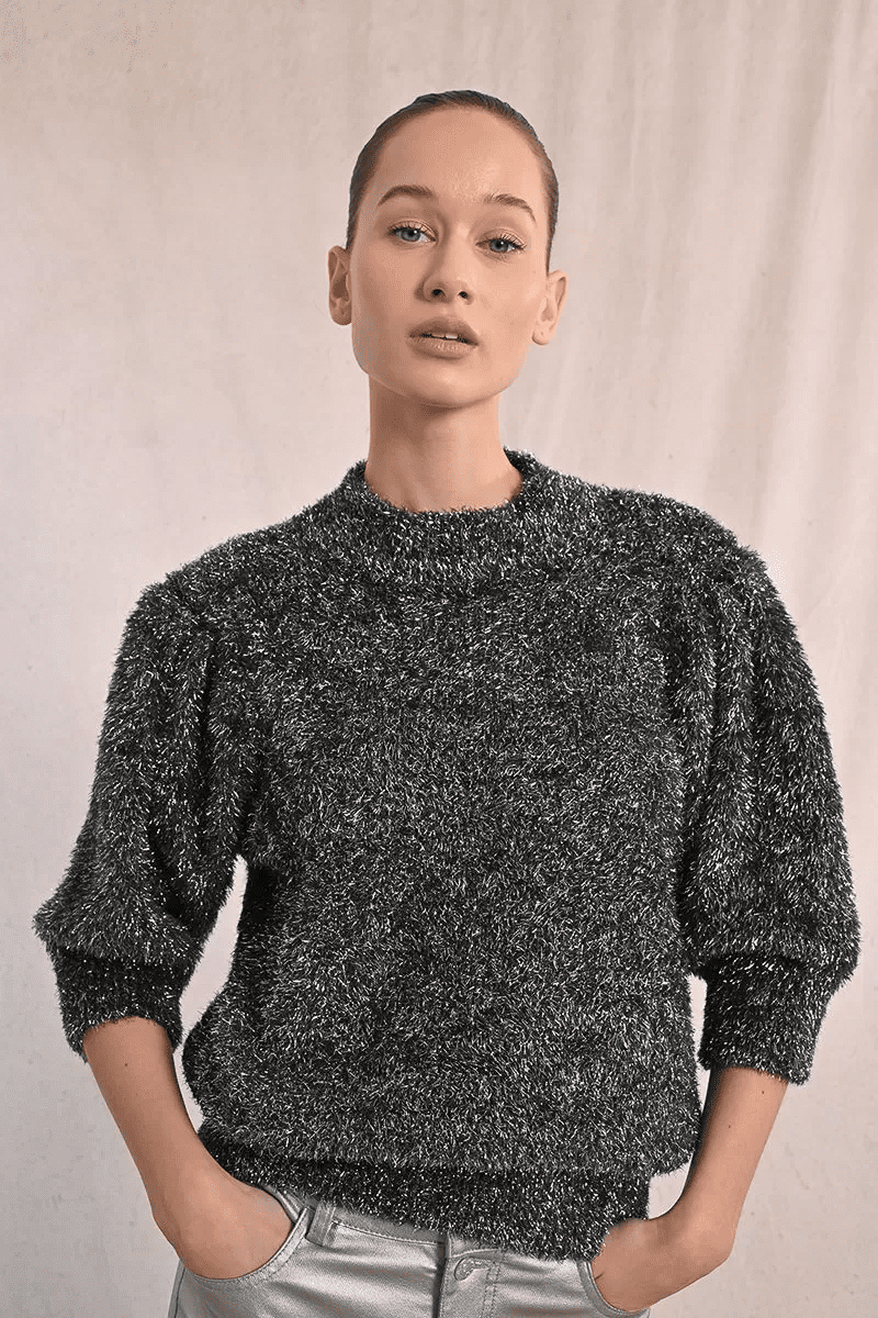 Textured and iridescent silver grey knit sweater, 3/4 balloon sleeves, Straight fit, Gathered shoulders.