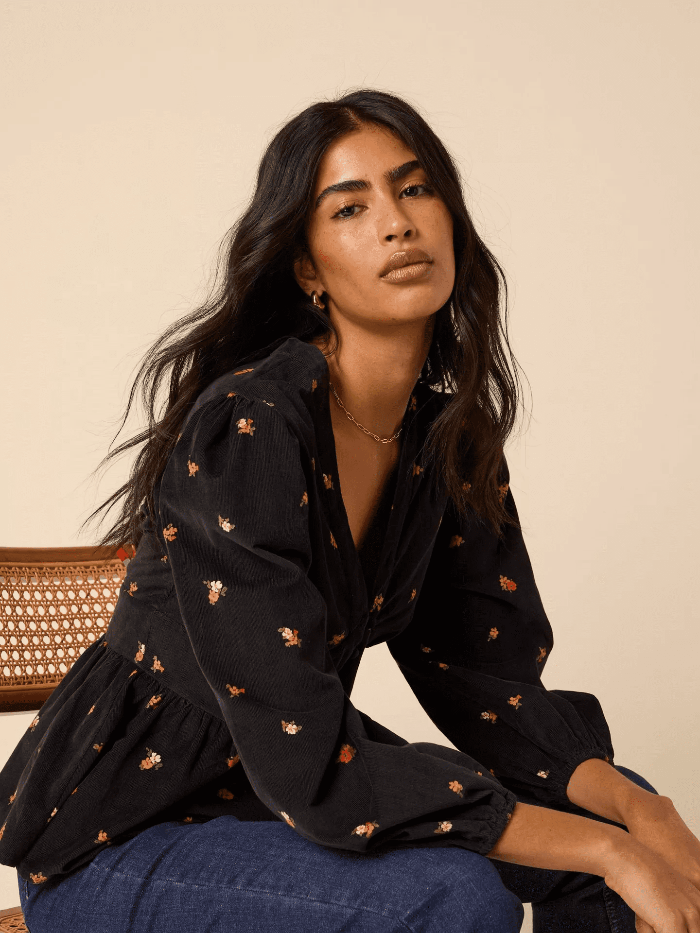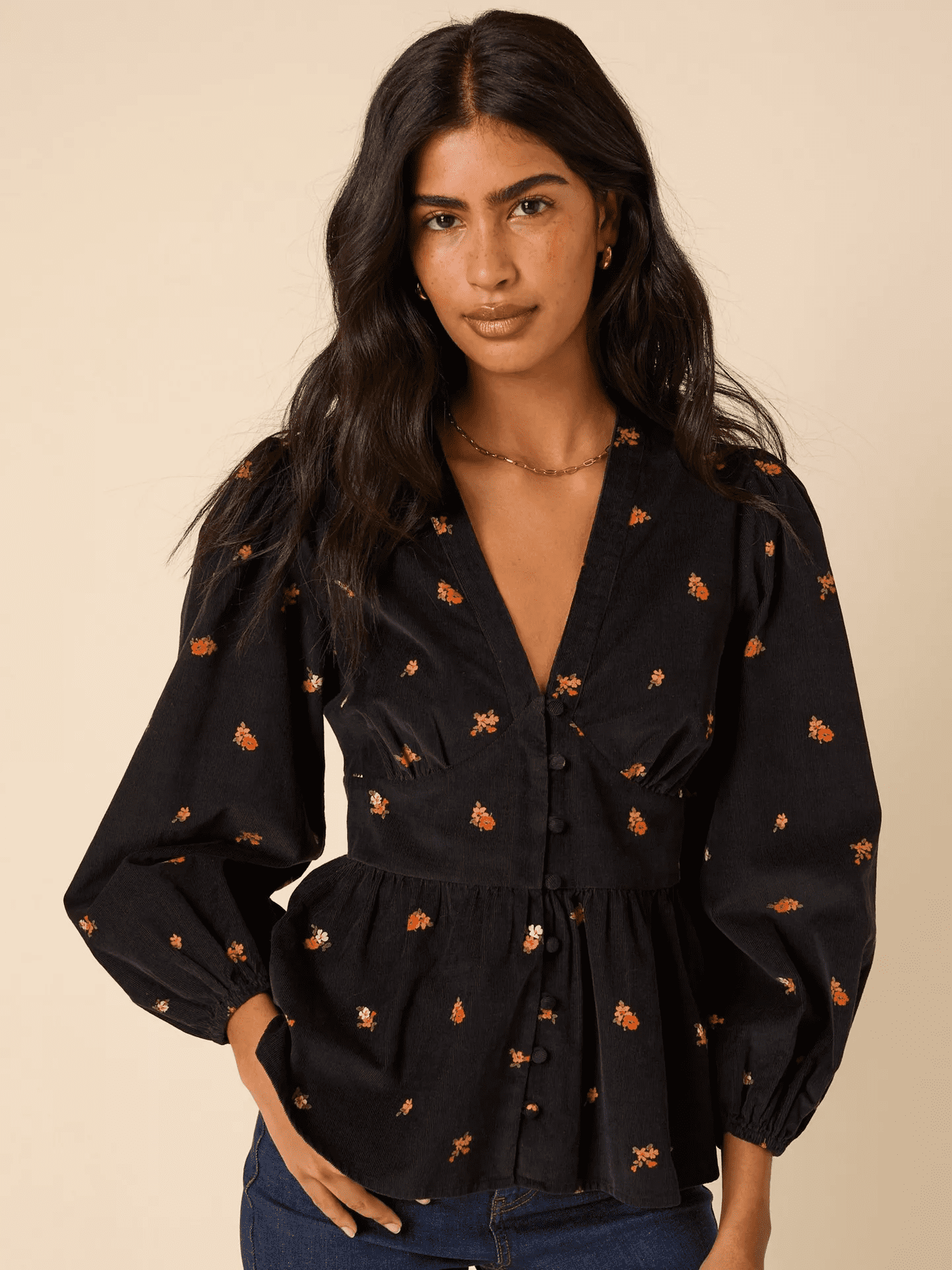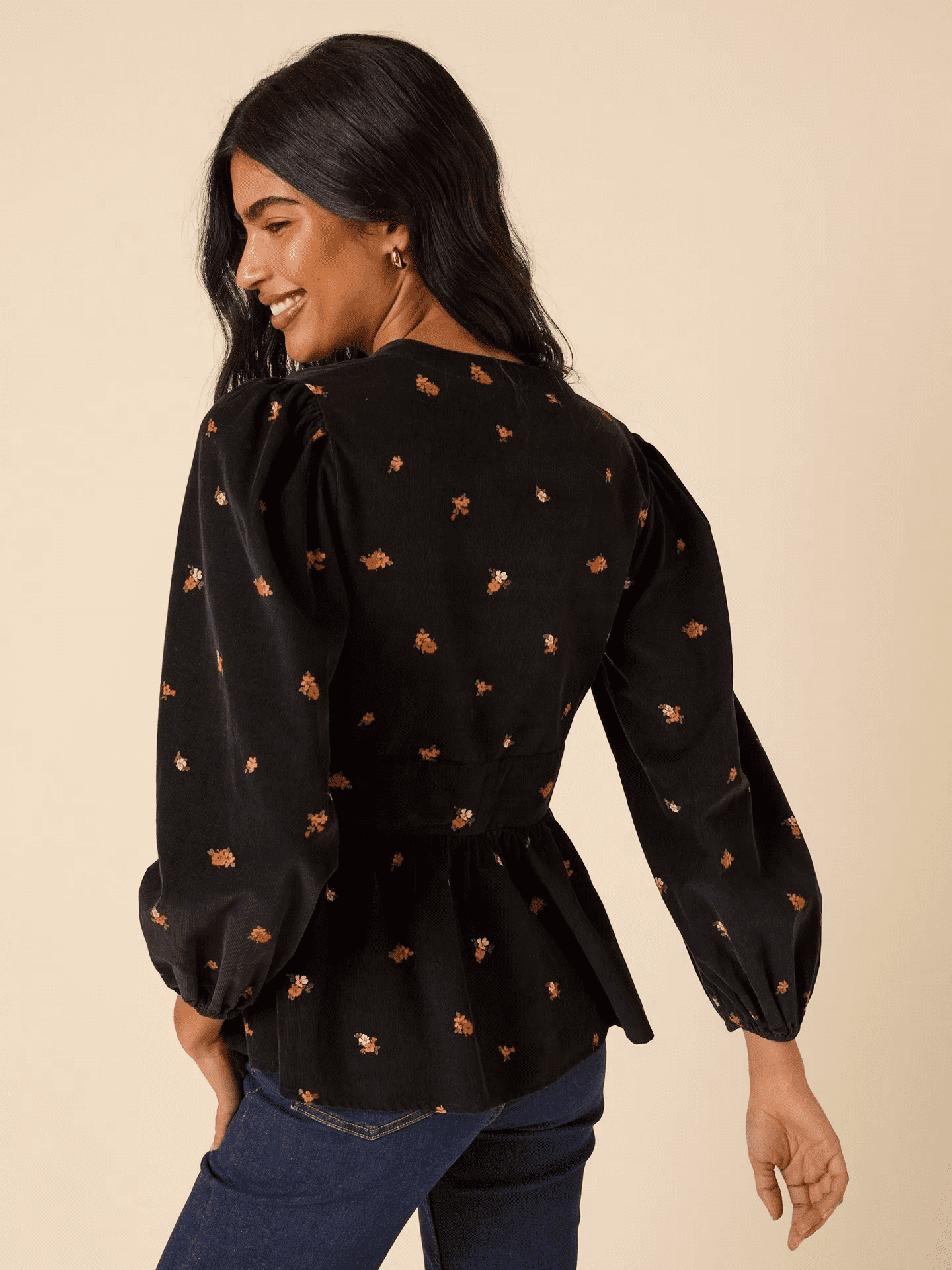 Beautiful black floral cord v neck top perfect for autumn casual chic!