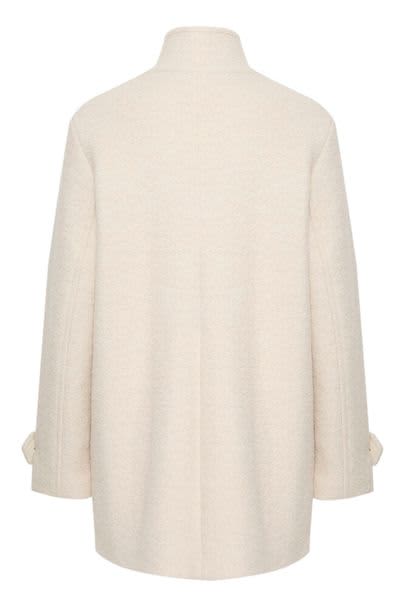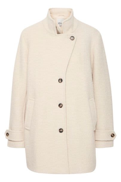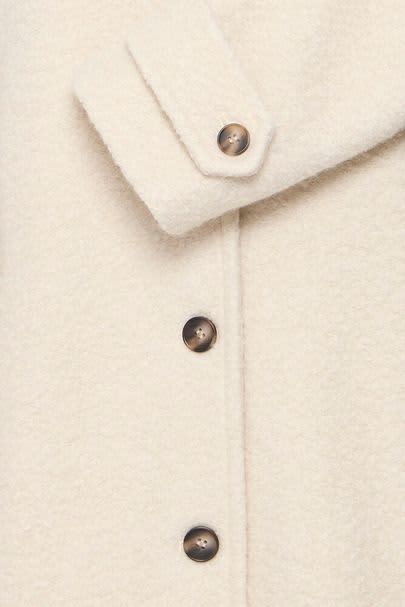 This chic wool mix coat has 2 front pockets, a sleeve loop at the cuff, brown buttons that close down the front and an asymetrical detail at the collar. The coat is fully lined.