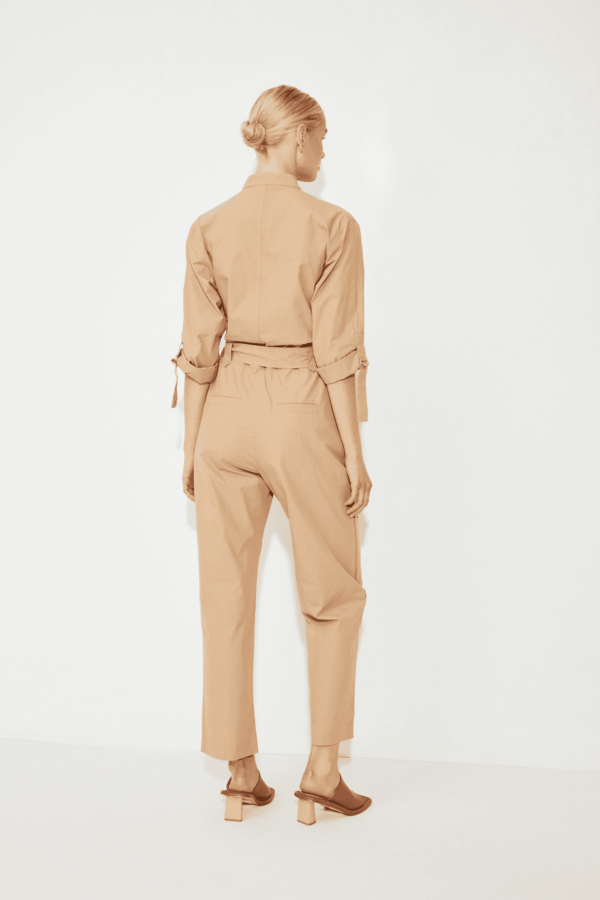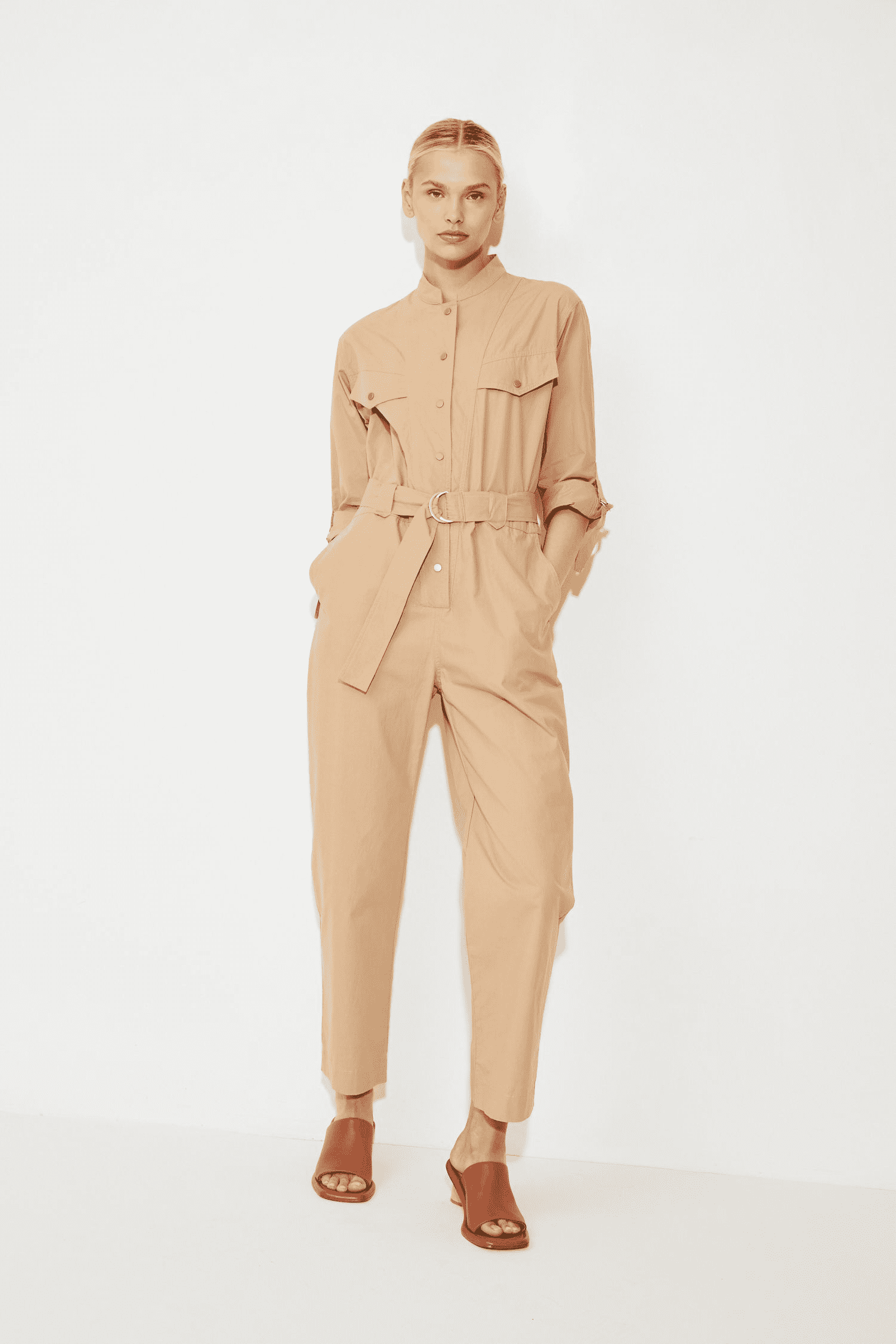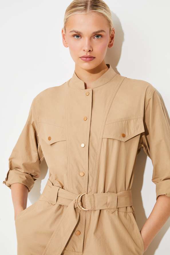 Long-sleeved jumpsuit, front buttoned closing, tone-on-tone removable double buckle belt, two side pockets, roll-up long sleeves