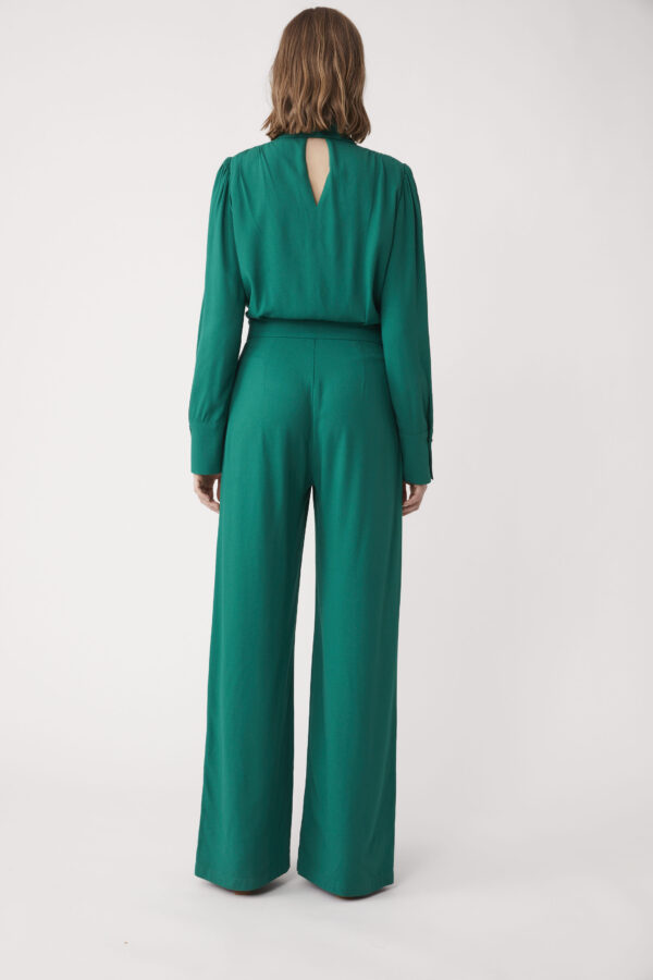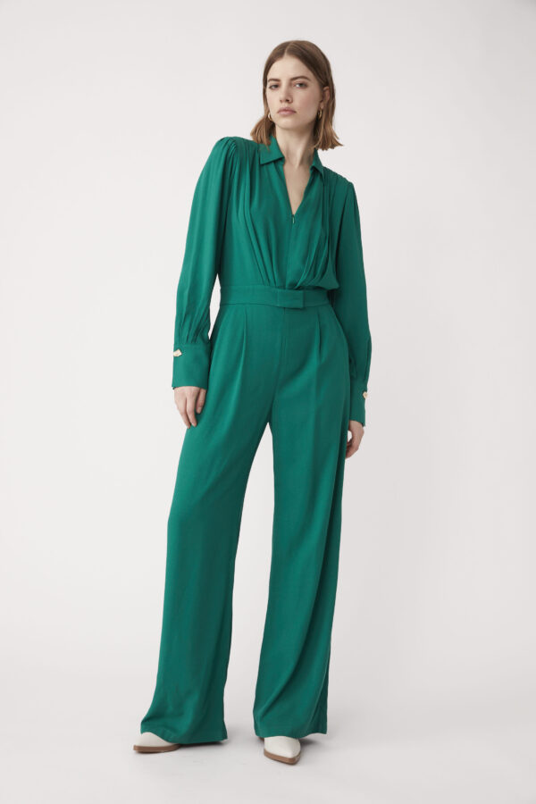 V-neck jumpsuit with zip and hook and eye closure and winged style collar. Beautiful cuff detailing. A head to toe look in one. Perfect for any occasion this season.