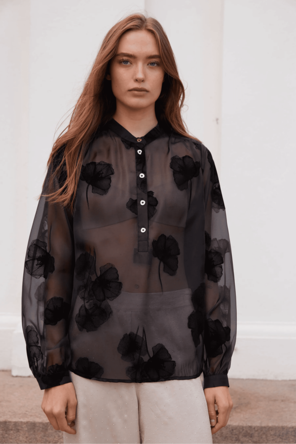 Beautiful sheer black blouse with floral pattern, half button down front and long sleeves.
