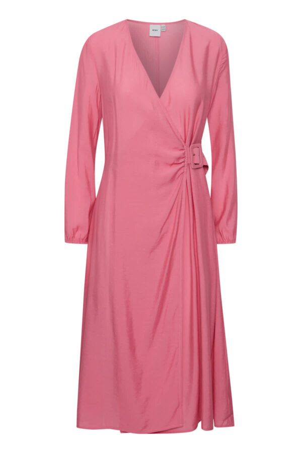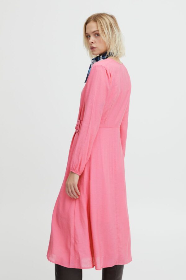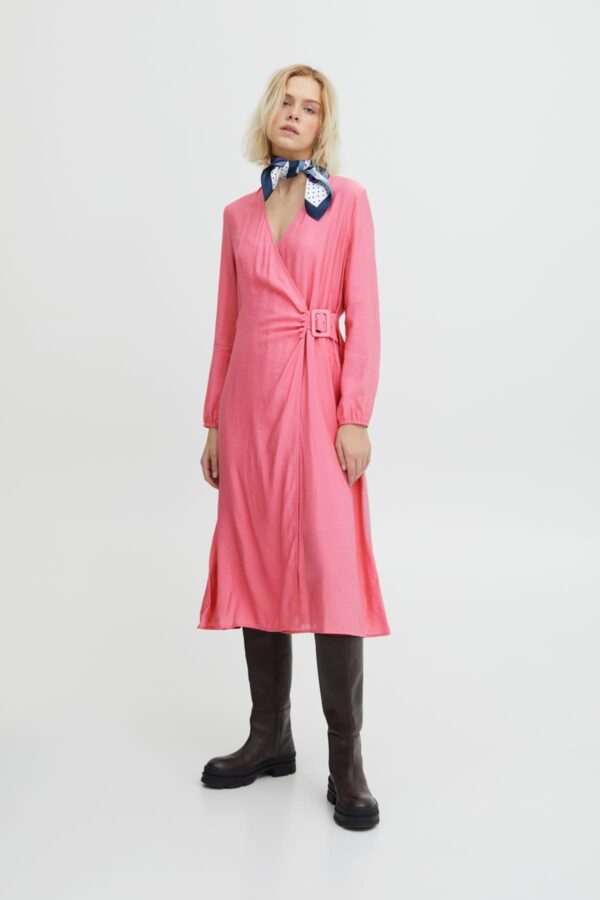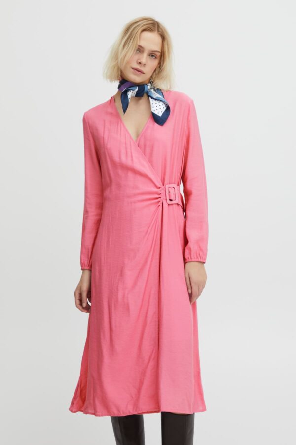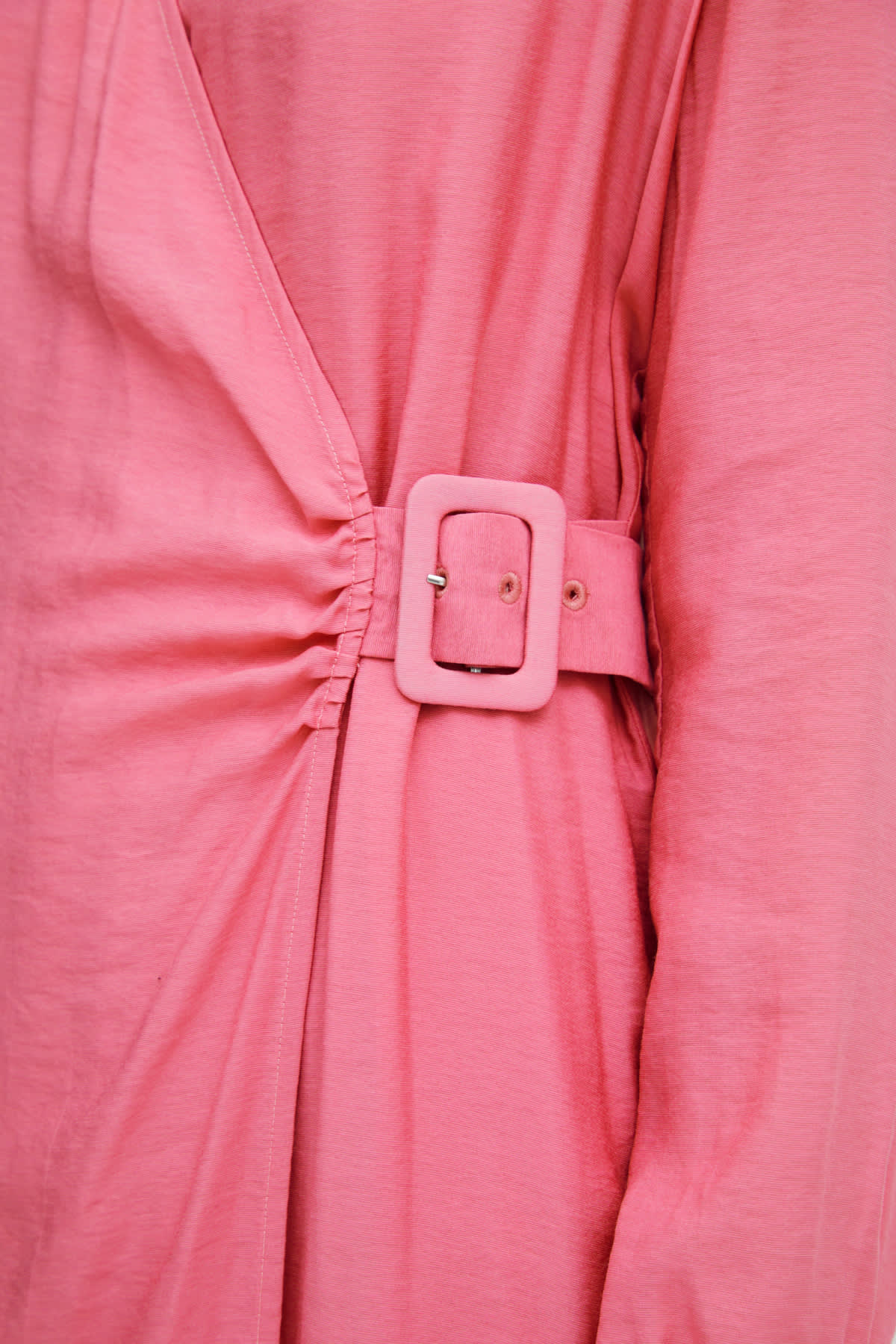 A feminine dress from in a beautiful spring colour. The dress is a wrap around with a belt detail on the side that creates a nice waist. The long sleeves have elastic at the cuff.