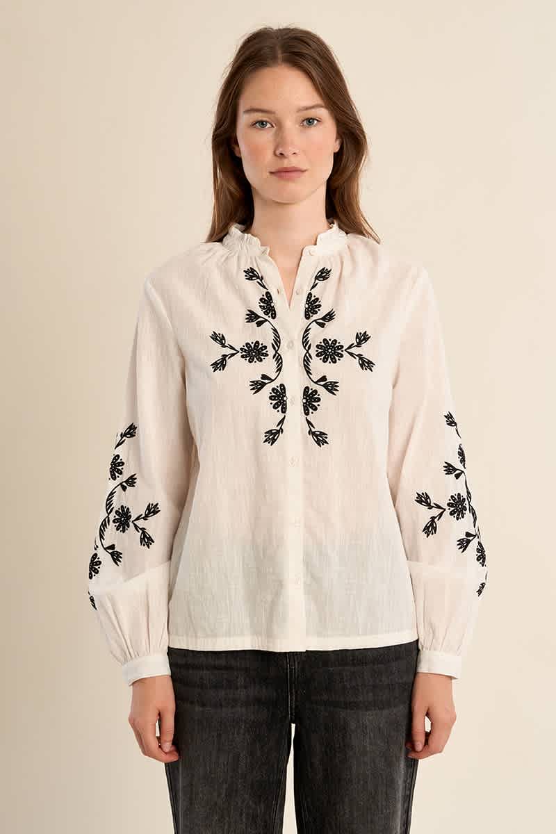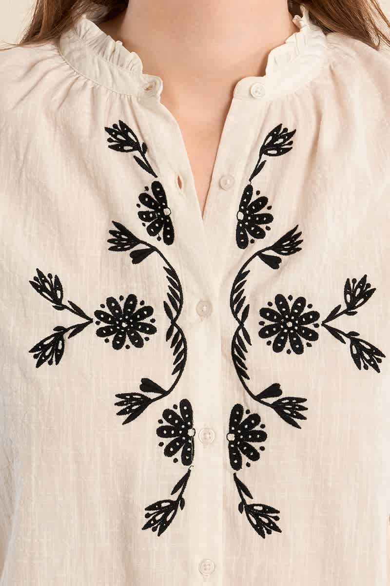 This beautiful embroidered blouse features long sleeves with buttoned cuffs and a mandarin collar with ruffles. It also has a button closure down the fronnt and a straight fit. The black embroidery is displayed on the front and sleeves. Wear with black trousers or jeans.