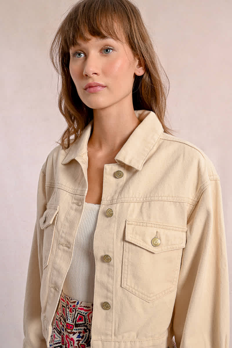Short jacket, long sleeves with buttoned cuffs, overrsized fitting, large chest patch pockets with flap cover and button closure in the middle front.