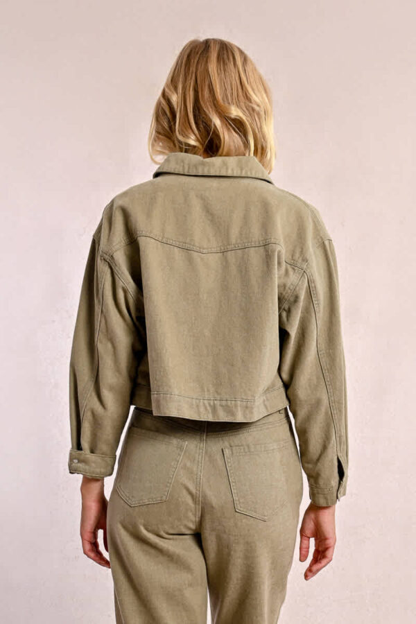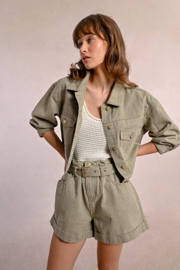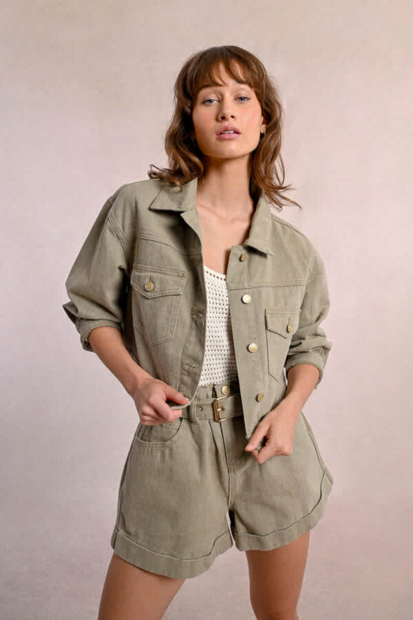 Short jacket, long sleeves with buttoned cuffs, overrsized fitting, large chest patch pockets with flap cover and button closure in the middle front.