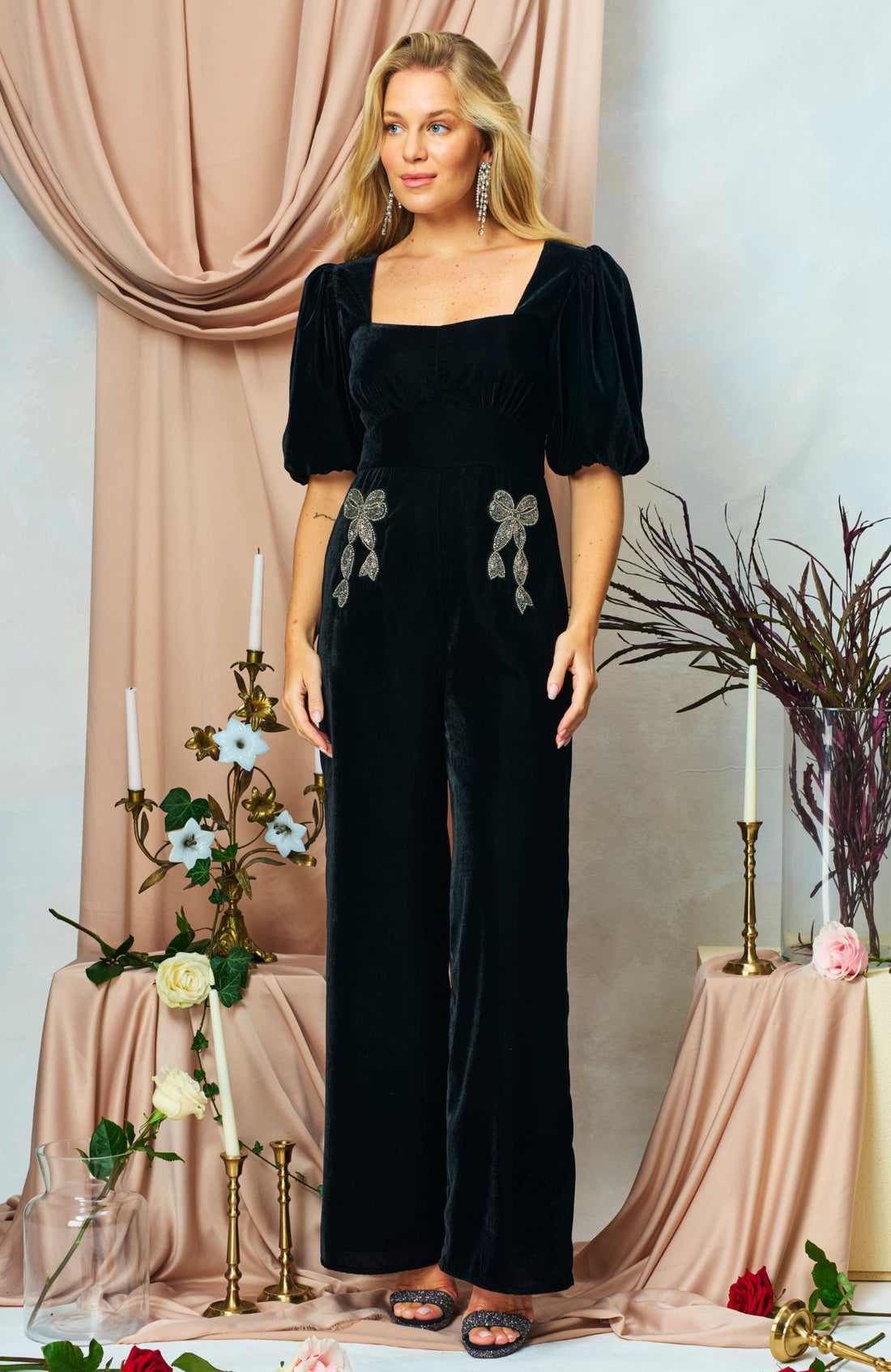 The Chelsea puff sleeve velvet jumpsuit is cut to a figure-enhancing silhouette. This stylish jumpsuit features a beautiful soft black velvet material, with two sparkling embellished bows decorating each hip. Further details include an oversized bow back with a gorgeous keyhole back, plus handy pockets and feminine puff sleeves. If dresses aren’t your occasion wear outfit of choice, this is the look for you! Match the sparkling details in this glamorous jumpsuit with the addition of matching silver jewellery. For added evening-appropriate elevation, add matching heels and a classic clutch bag.