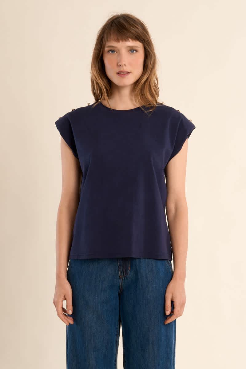 This navy sleeveless tank top features a round neckline and gold button detail on the shoulders. The shoulders are padded giving this tank a lovely shape. It has a straight fit and would be lovely styled with a pair of skinny jeans.