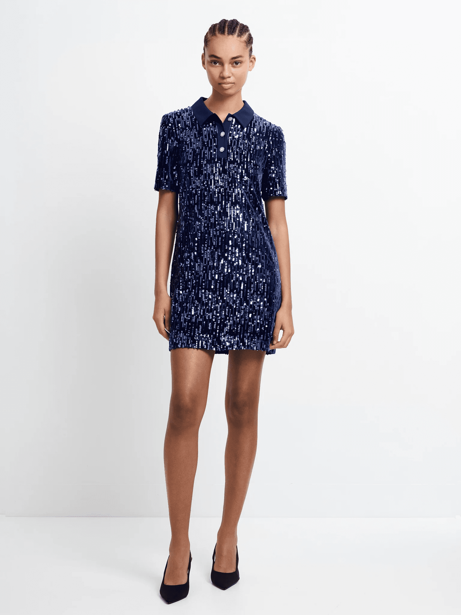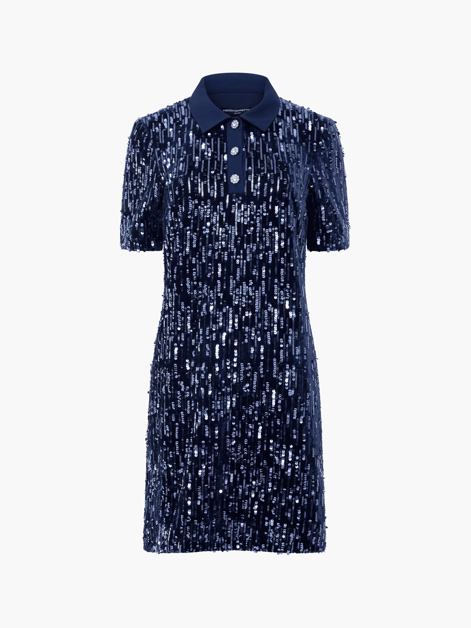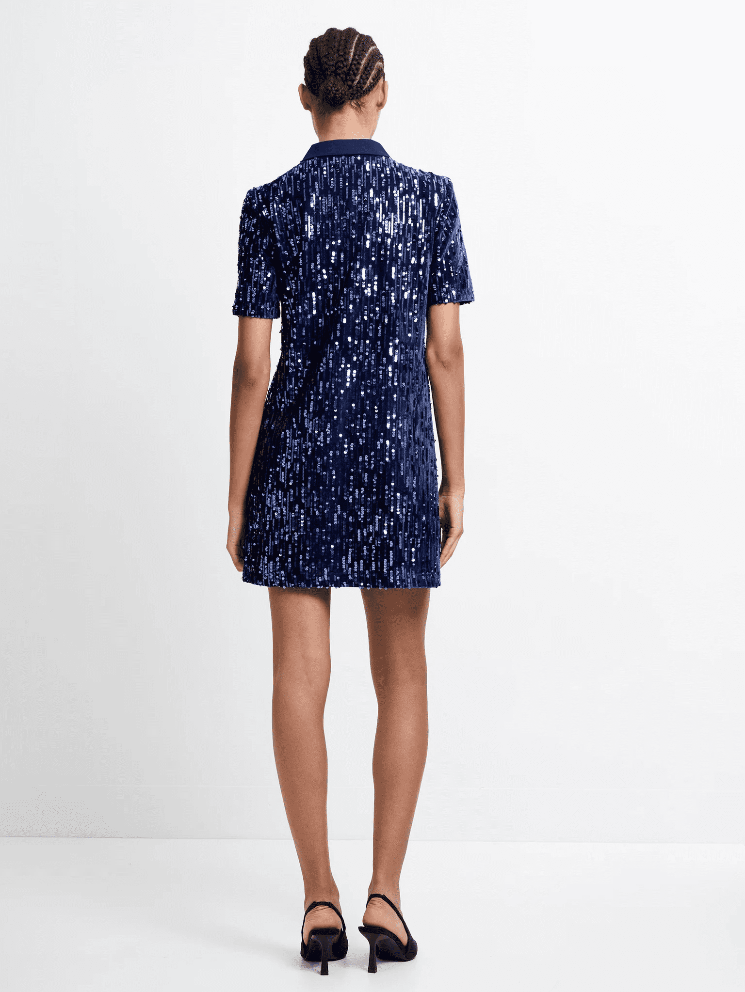 Trinny Velvet Sequin Collared Mini Dress is a playfully poised favourite. This velvet little number is adorned with tonal sequin stripes, whilst finished with a smart polo collar and placket boasting diamante embellished buttons.