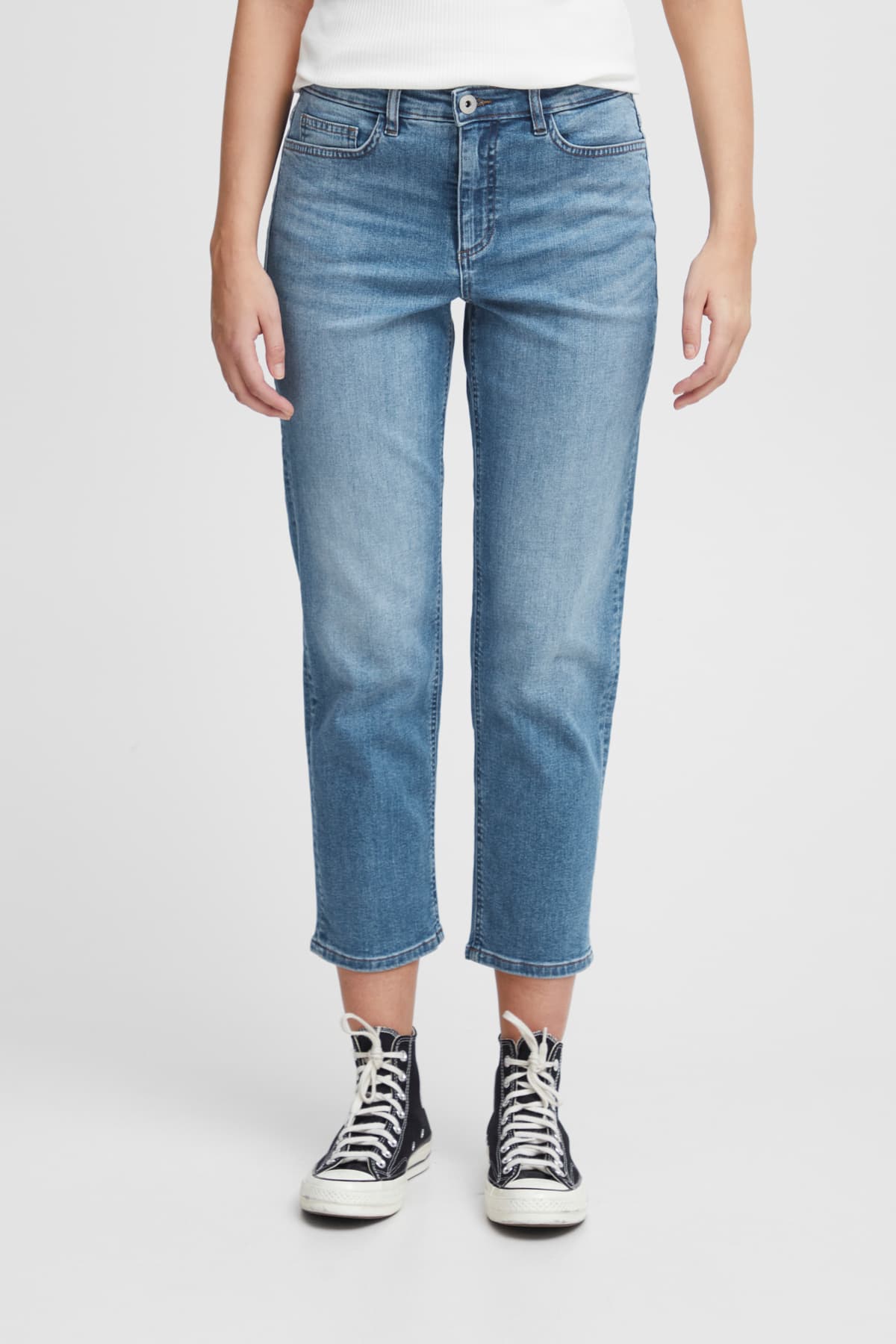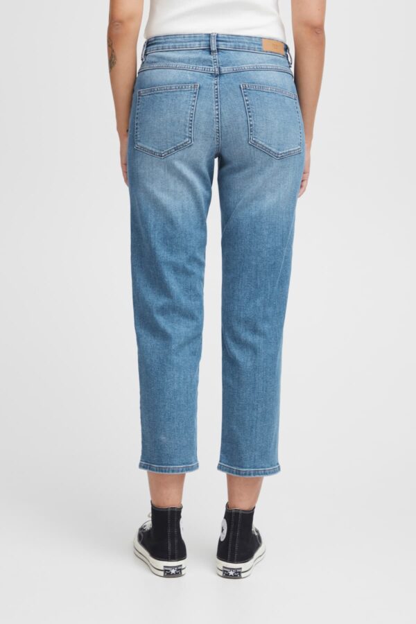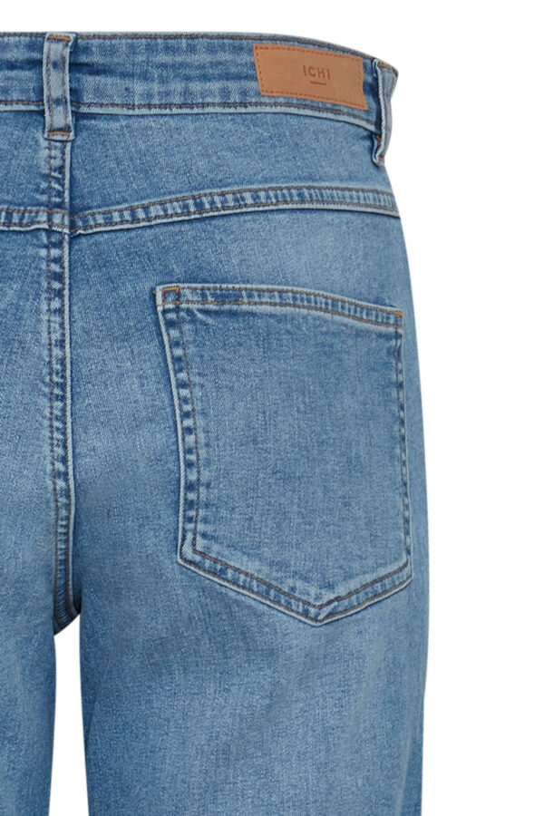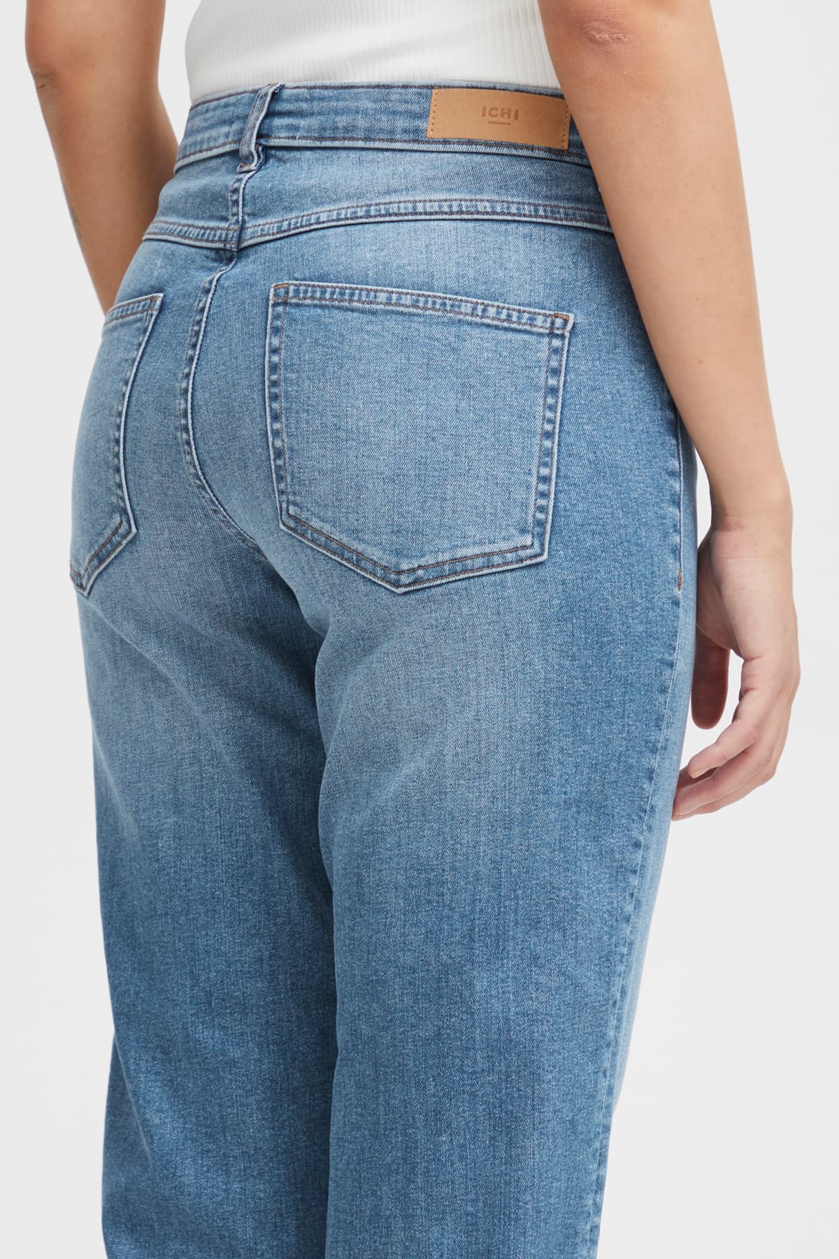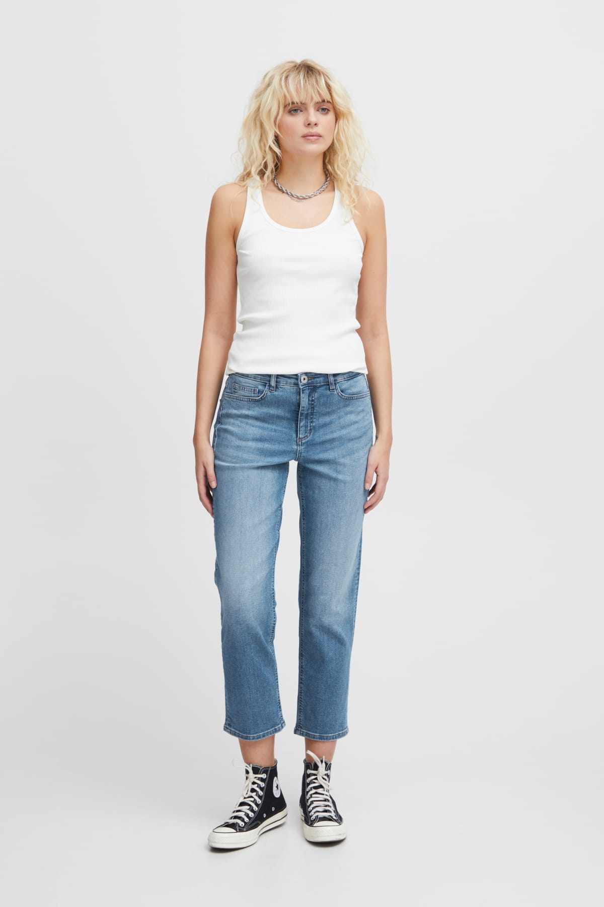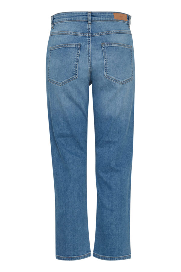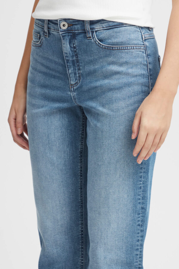 Ichi Twiggy Raven Denim Jeans, a straight fitting, high waisted pair of mid blue denim jeans with 5 pockets and a button and zip fastening.