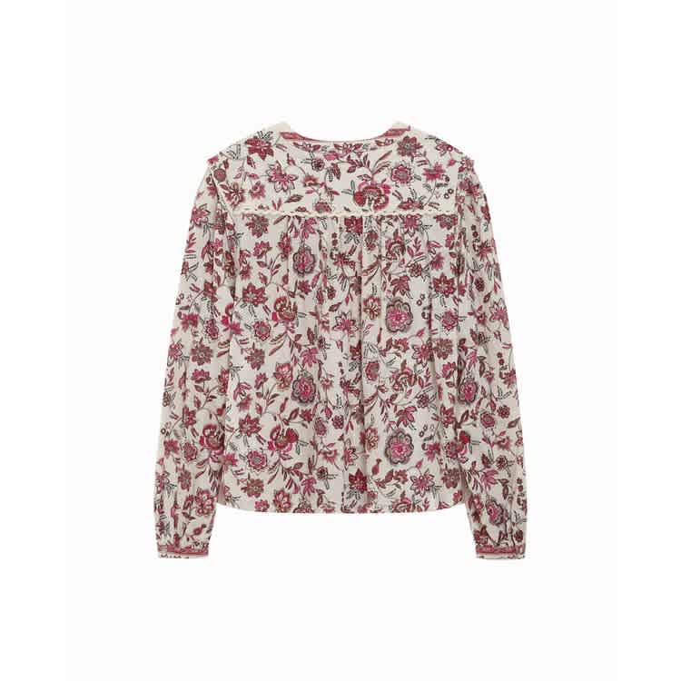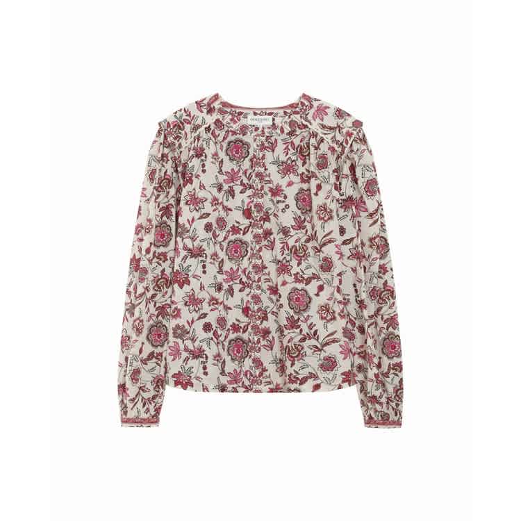 100% Cotton floral blouse with round neck and button down front. This pretty blouse has puff sleeves and a padded detail on the shoulder.