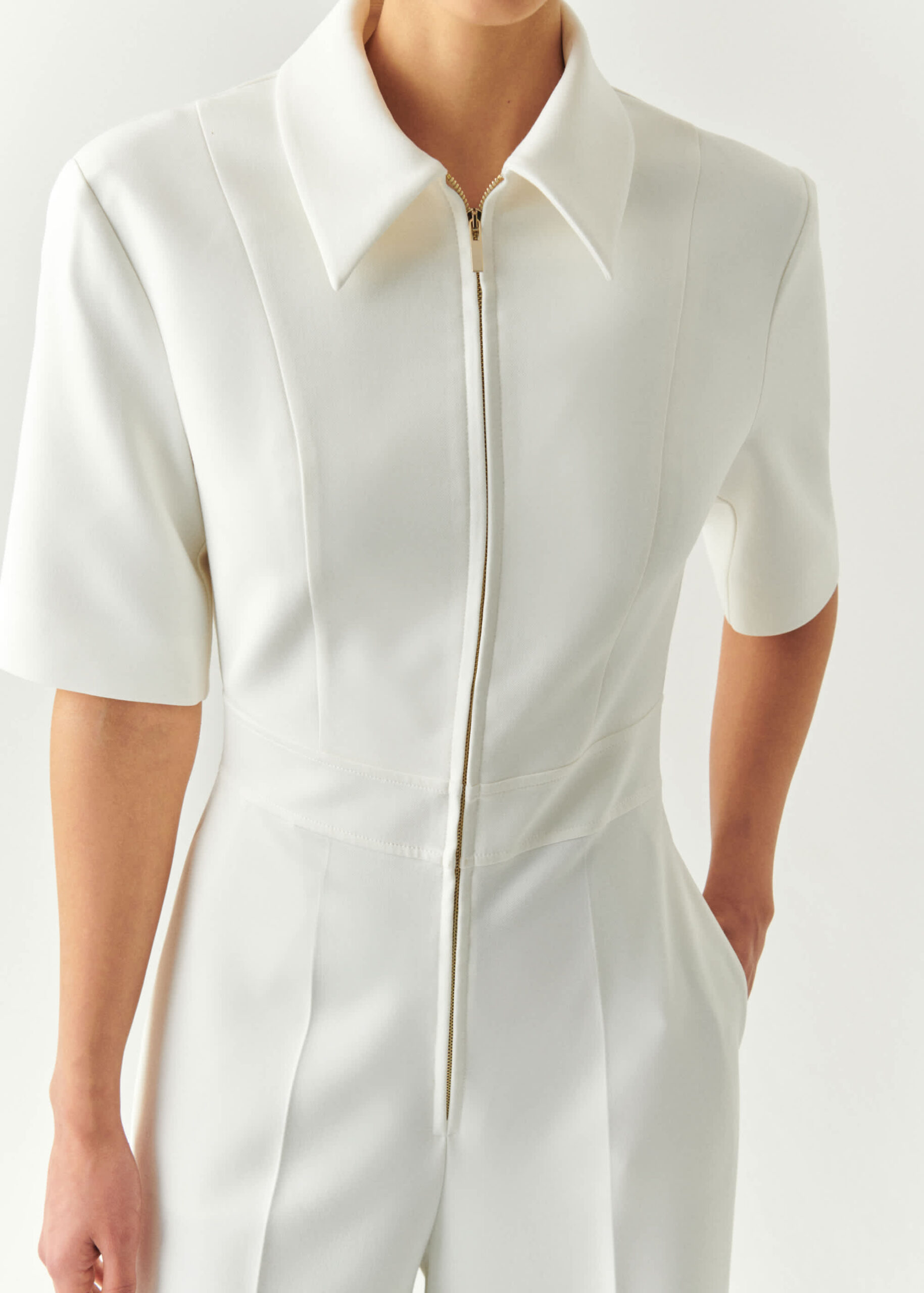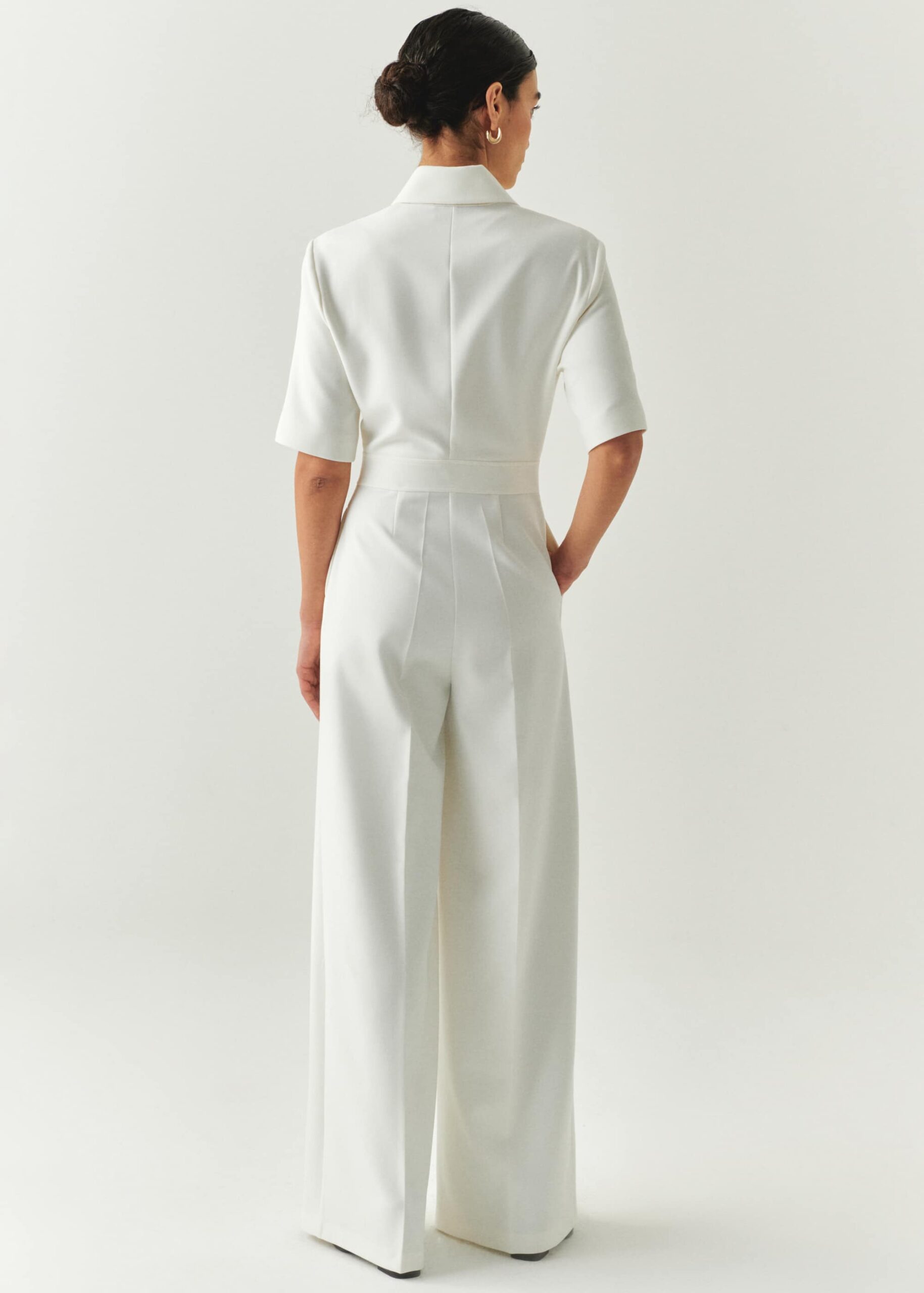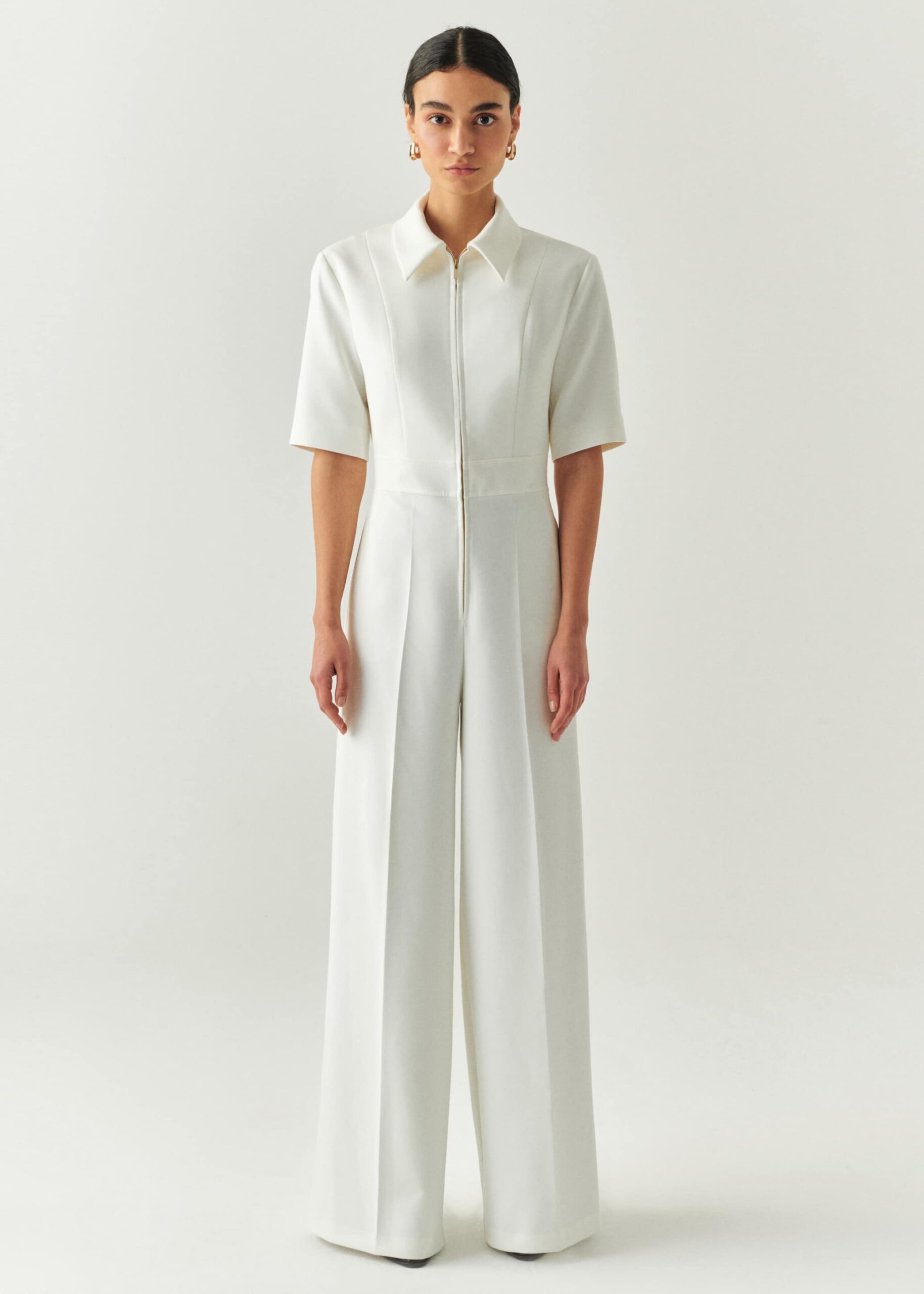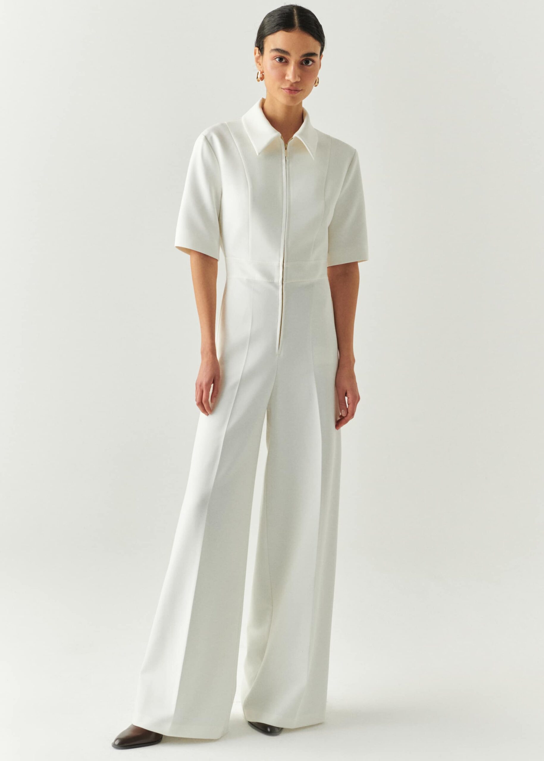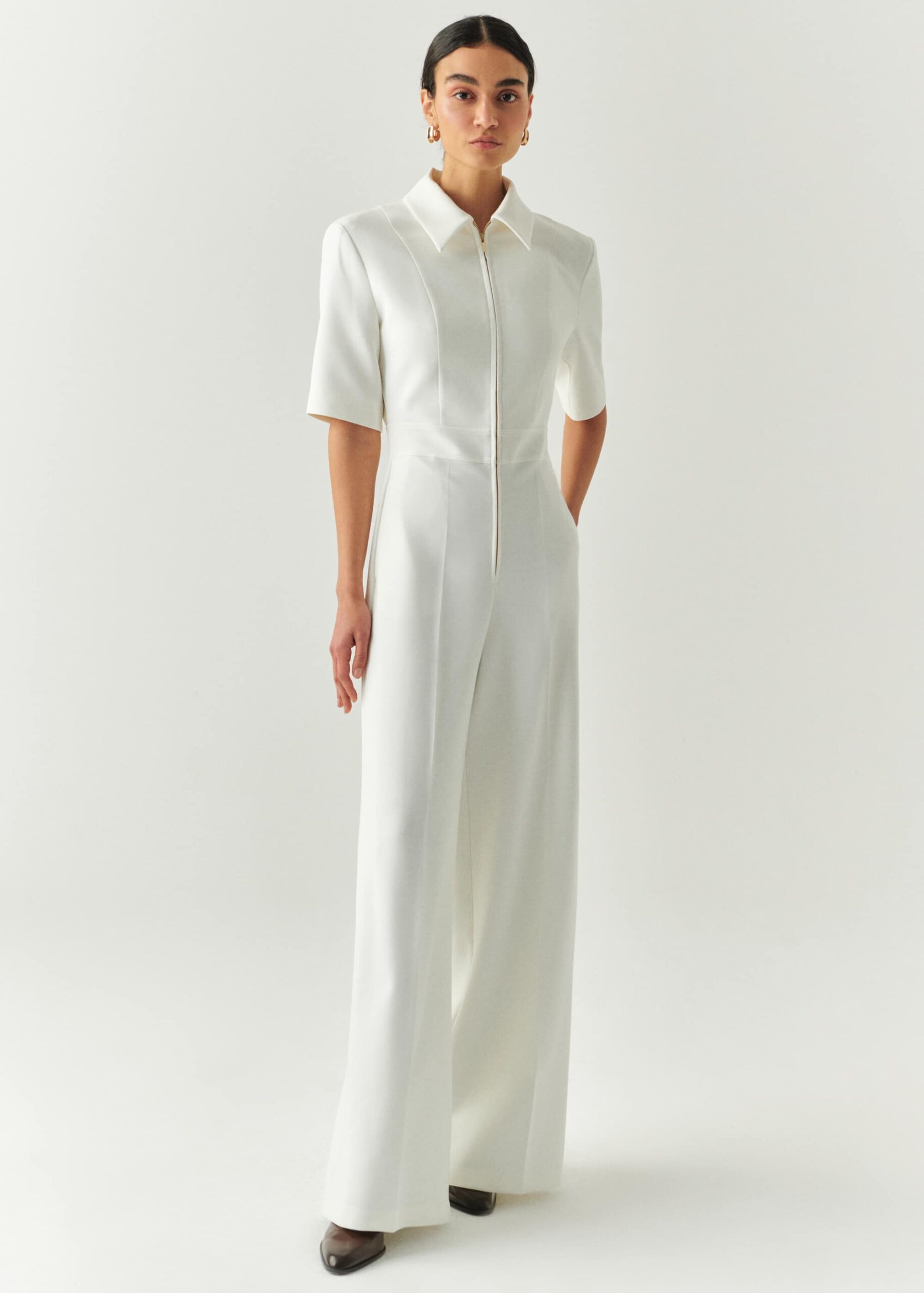 A formal jumpsuit perfect for any special occasion. Gold zip detail. Pockets, classic wide leg.