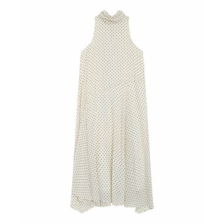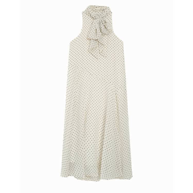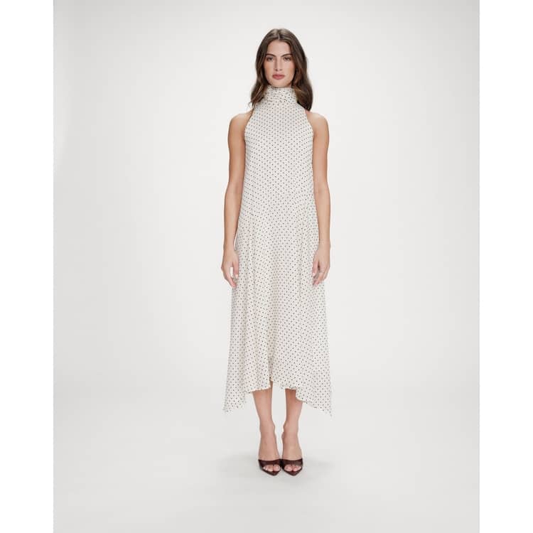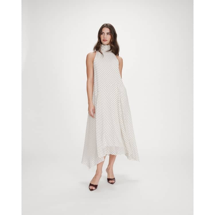 This fully lined polka dot midi dress features a tied high neck and a teardrop opening at the back. It has an asymmetrical cut that creates an airy effect and offers a graceful and elegant silhouette. The polka dots are velvet flocked making this dress a timeless piece to have in your wardrobe. This sleeveless dress is beautiful styled with a pair of black strappy sandals.