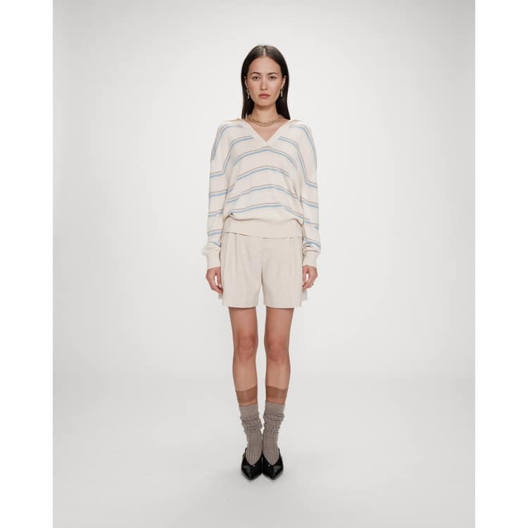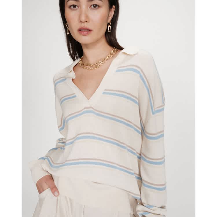Super soft fine knit striped jumper with long sleeves and collared v-neck line.