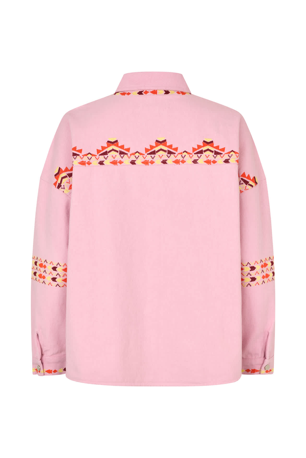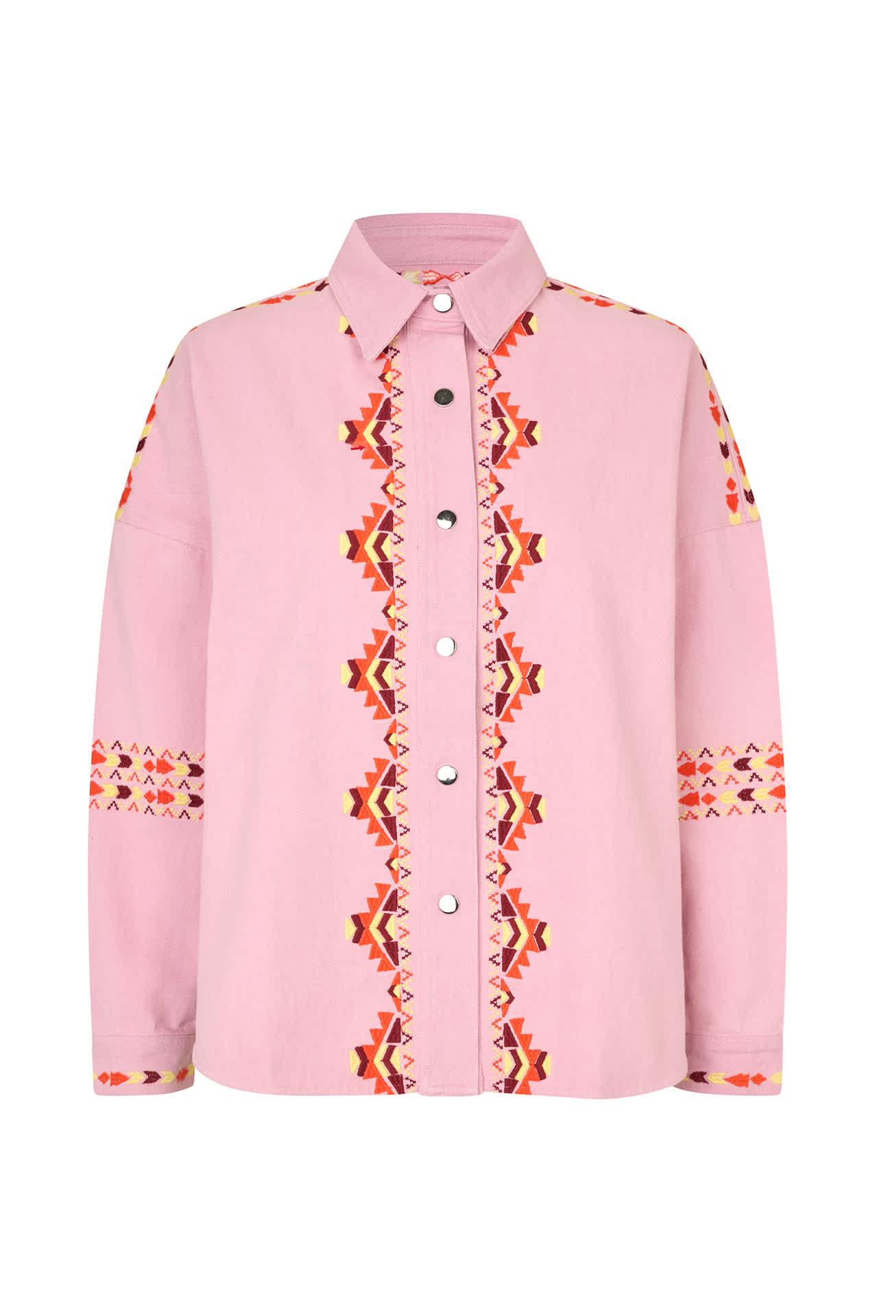 Add a colorful touch to your wardrobe with the Veida shirt. Designed in a soft denim quality with beautiful embroidered details in warm red, yellow and orange tones that give it a personal and lively expression. Styles perfectly with jeans and trainers for a cool casual look. Oversized fit with dropped shoulders.