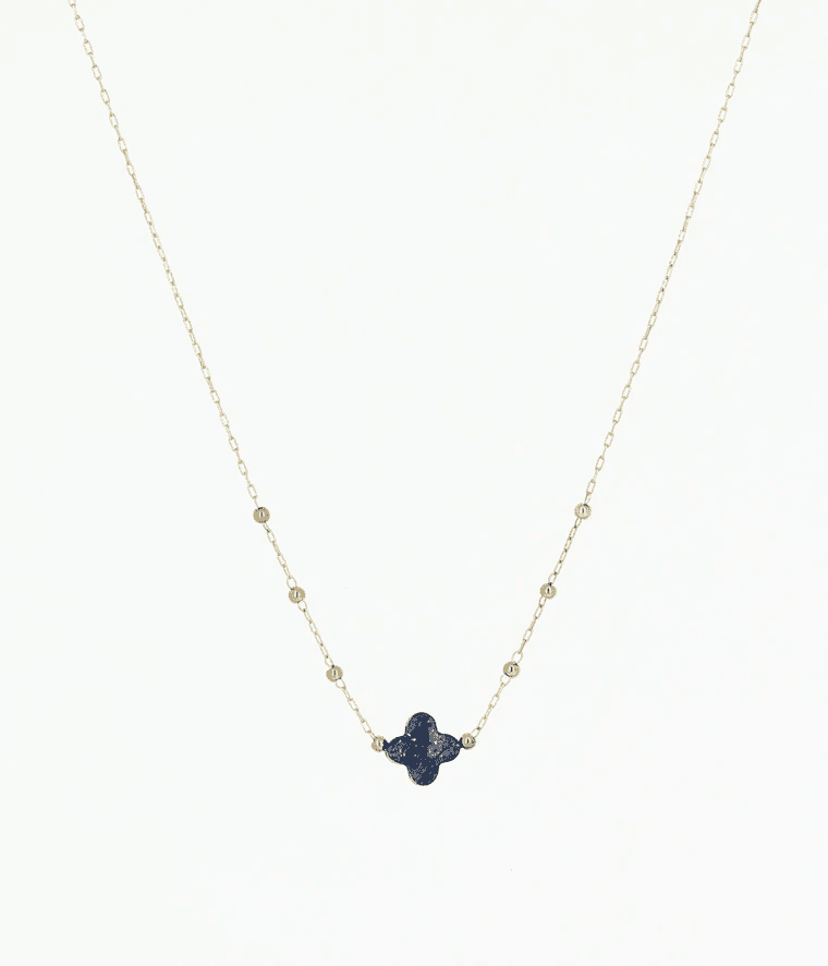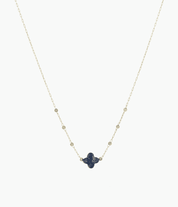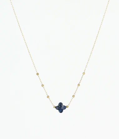 Delicate gold plated necklace with a natural blue tone stone in the shape of a small clover is attached.