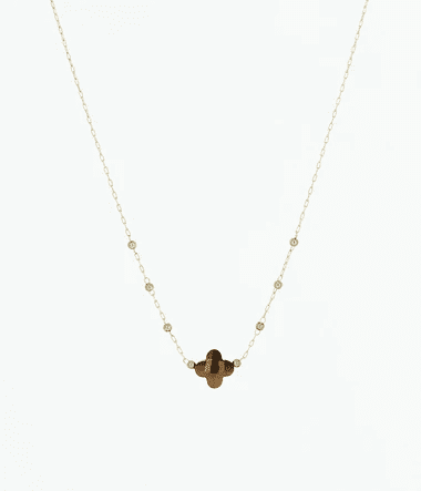 Necklace “rosary” chain in plain steel or gold-plated with fine gold to which a natural stone in the shape of a small clover is attached.