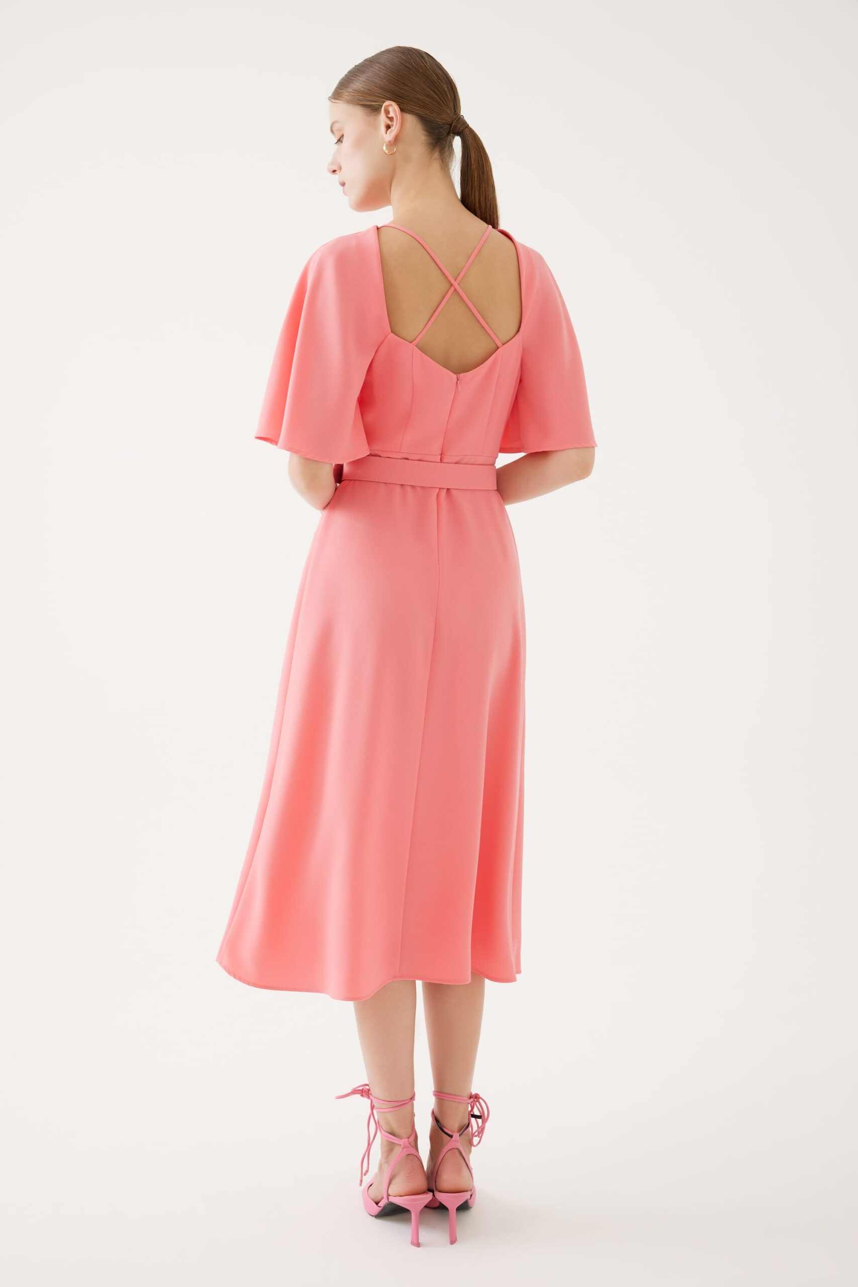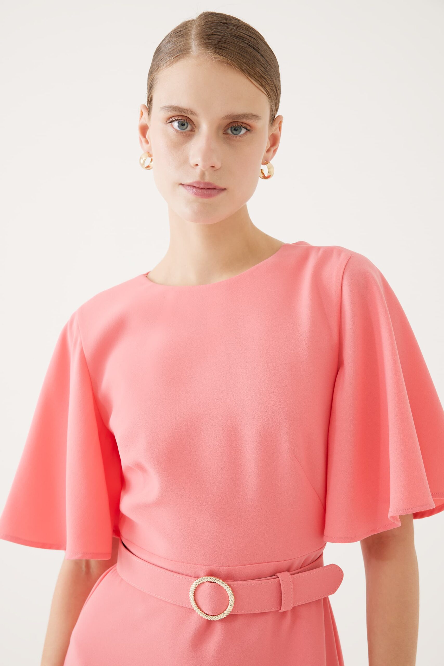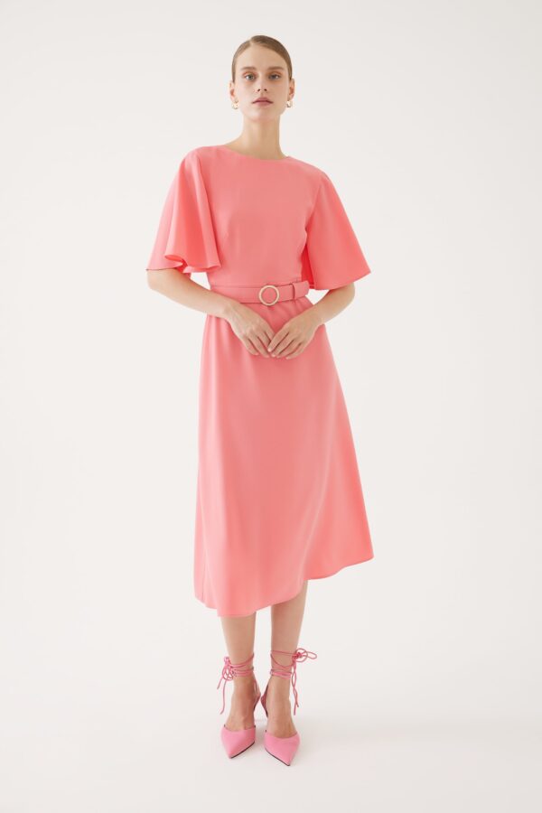 A simple but elegant beauty with just a touch of detailing. It has a classic a-line shape and soft flutter sleeves. A cut out back that is not to low with a little criss cross detail. Add the matching belt with gold buckle for that extra glam touch. Perfect peach for that spring summer event.