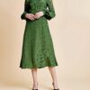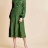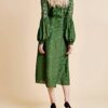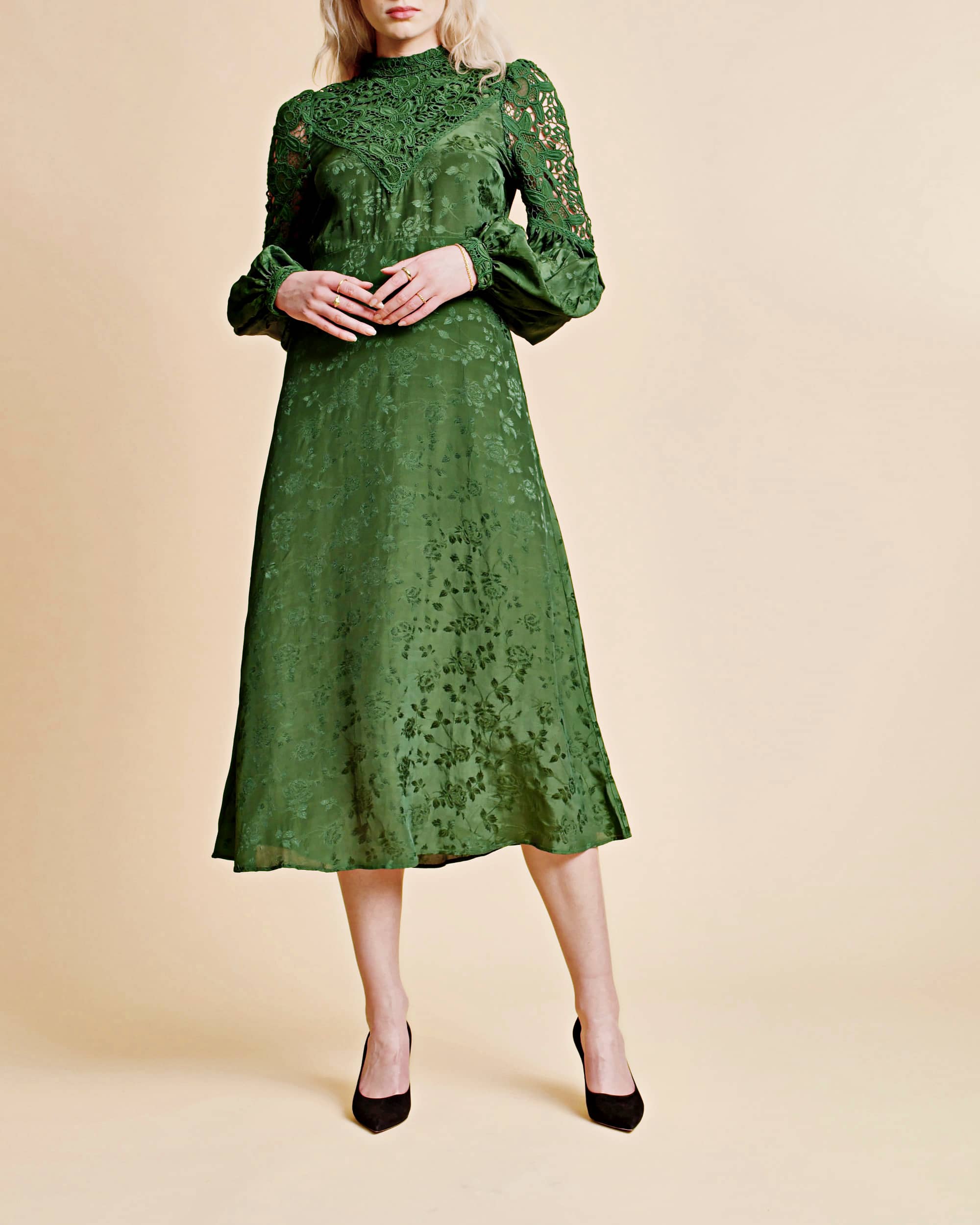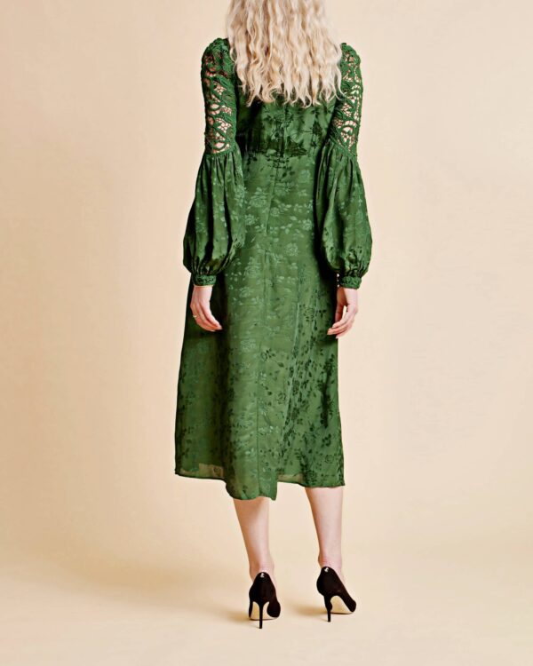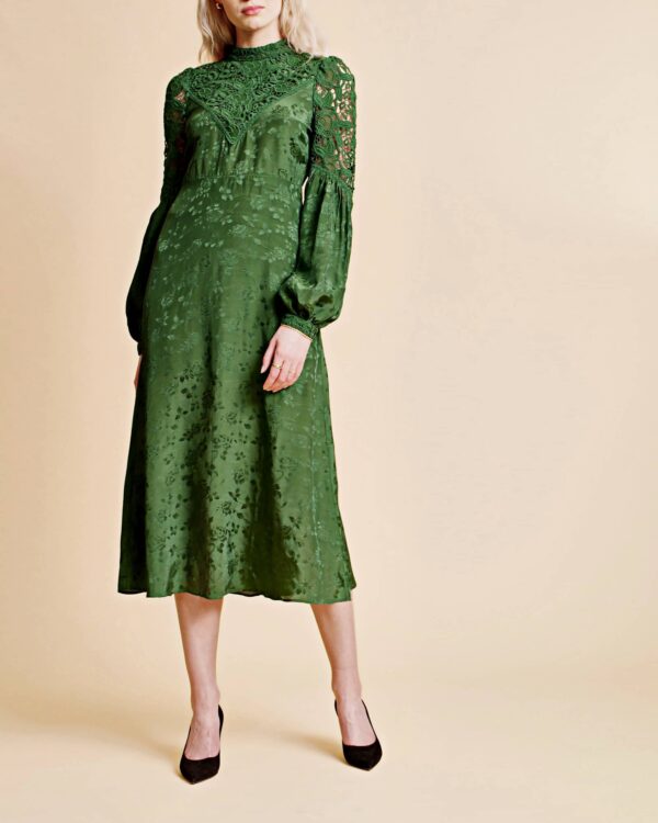 The Jacquard Lace Dress is cut in 100% certified viscose quality with a soft shine and delicate hold, and the jacquard pattern is a beautiful rose. It has a midi length, slightly fitted silhouette and long balloon sleeves with tight cuffs. The dress has a round neckline and beautiful lace inserts on the shoulders and above the chest.