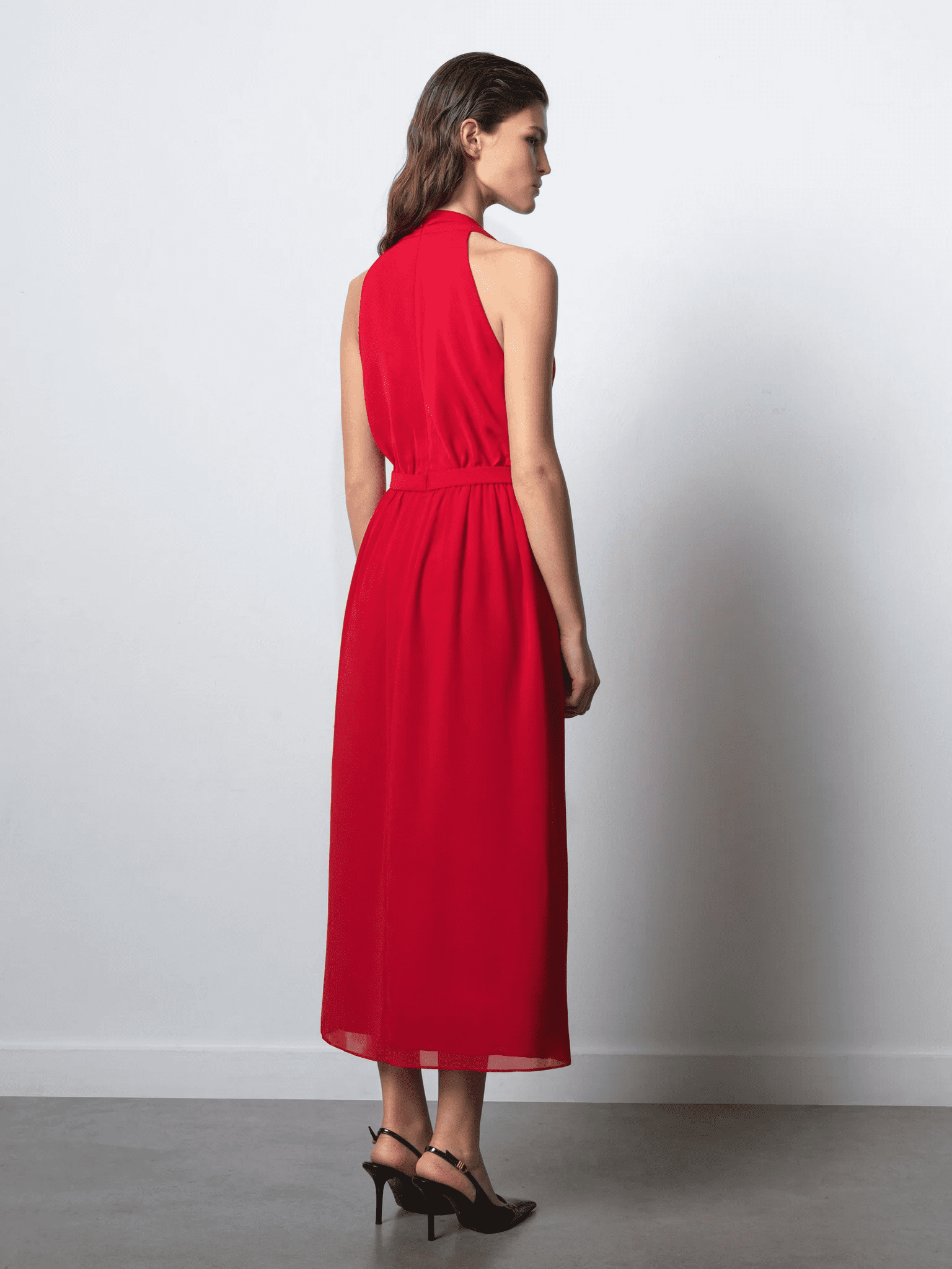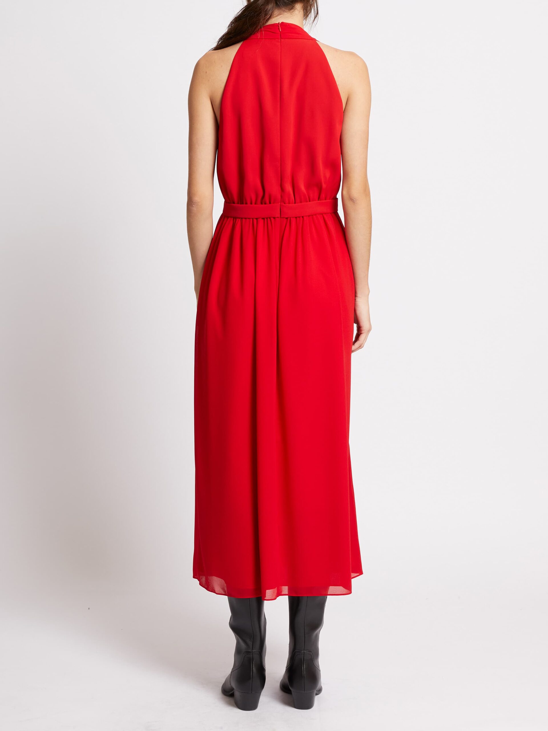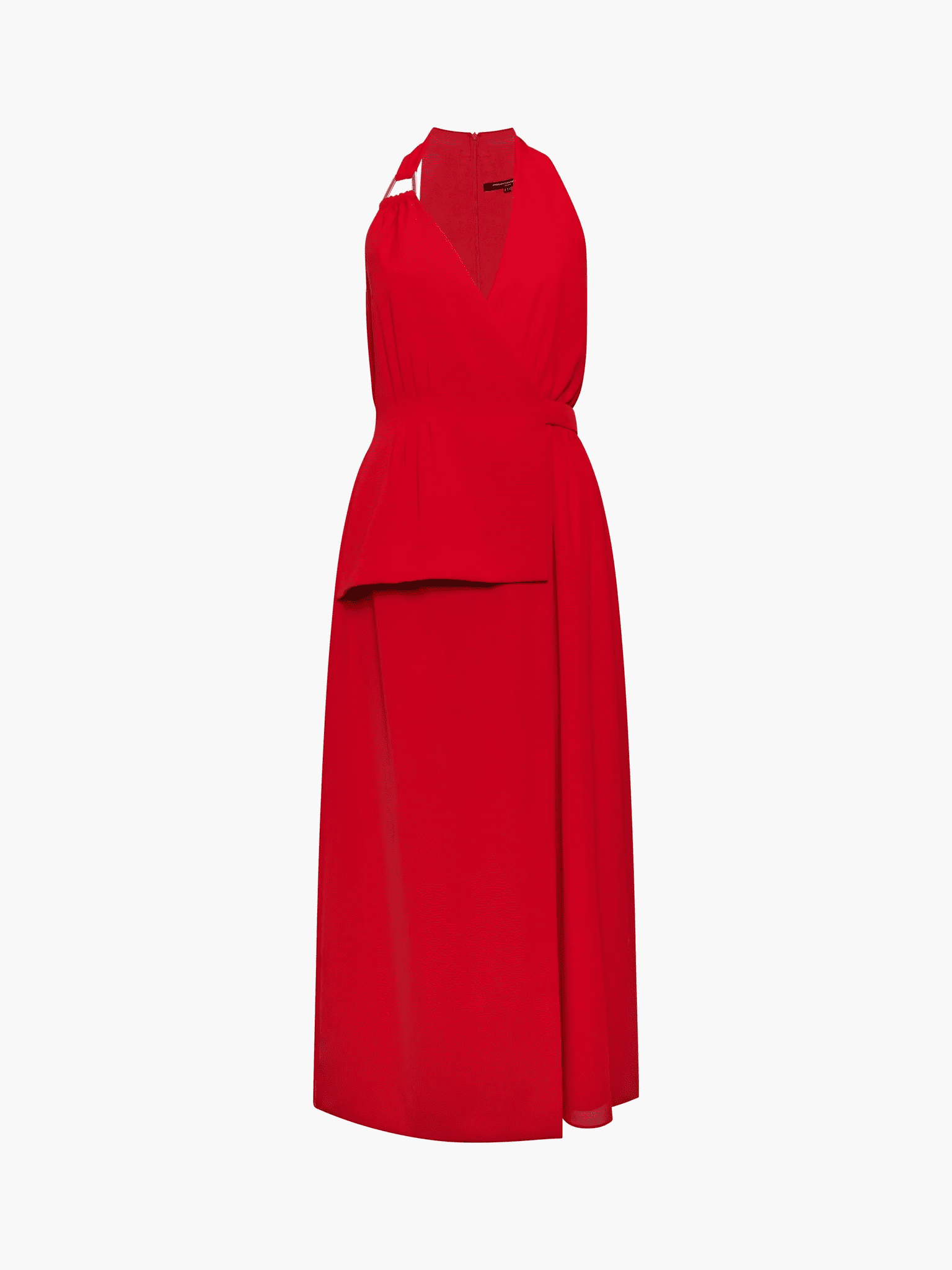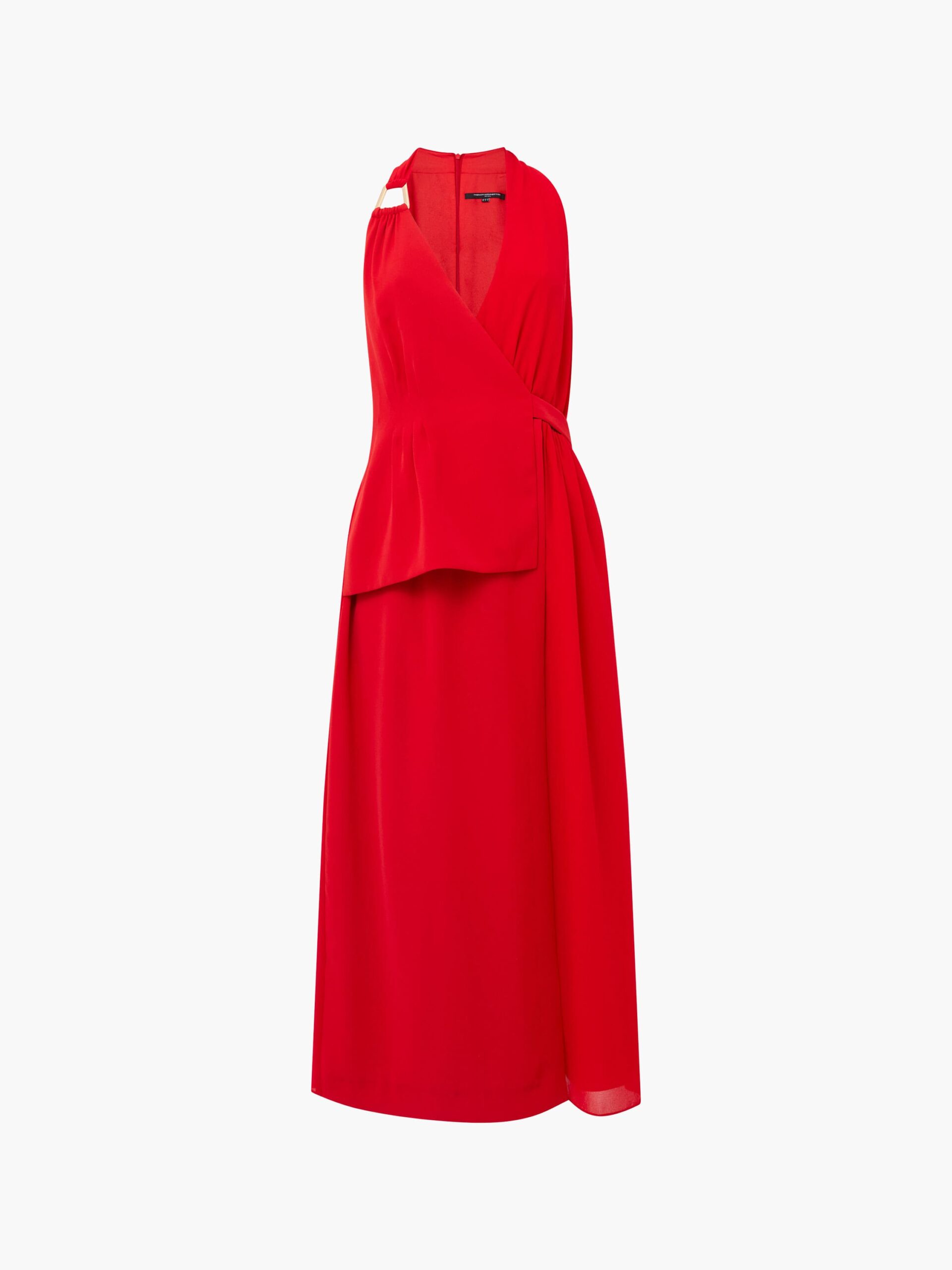This striking red dress features contemporary tailoring and detailing. It features a V-neckline and a racer back with a zip up the back. We adore the style of this dress with the top looking like a waistcoat with flattering ruching at the waist and the bottom looking like it is a wrap dress with the added layer of material. It also features a gold bar on the collarbone for a touch of glam. Fully lined.