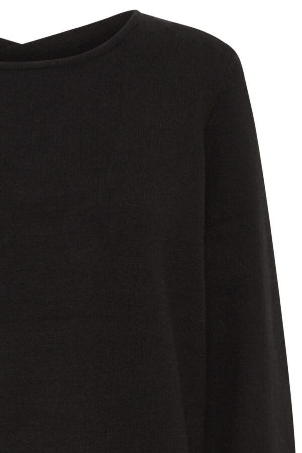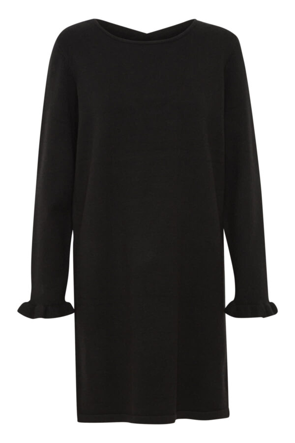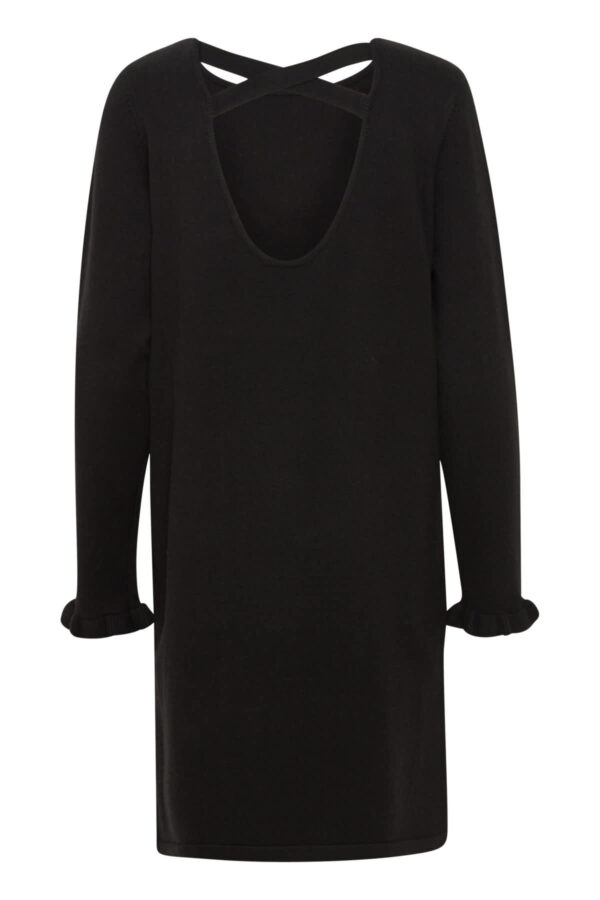 A classic black knit dress with a twist! Frill detailing to the cuff and a criss cross back give it that extra bit of flare. Gorgeously soft and perfect for layering this autumn winter.