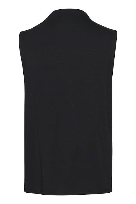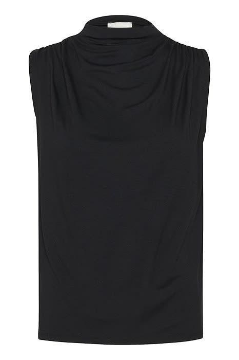 Sleeveless, high neck black top with gathered seam detail on the shoulders. A perfect basic.