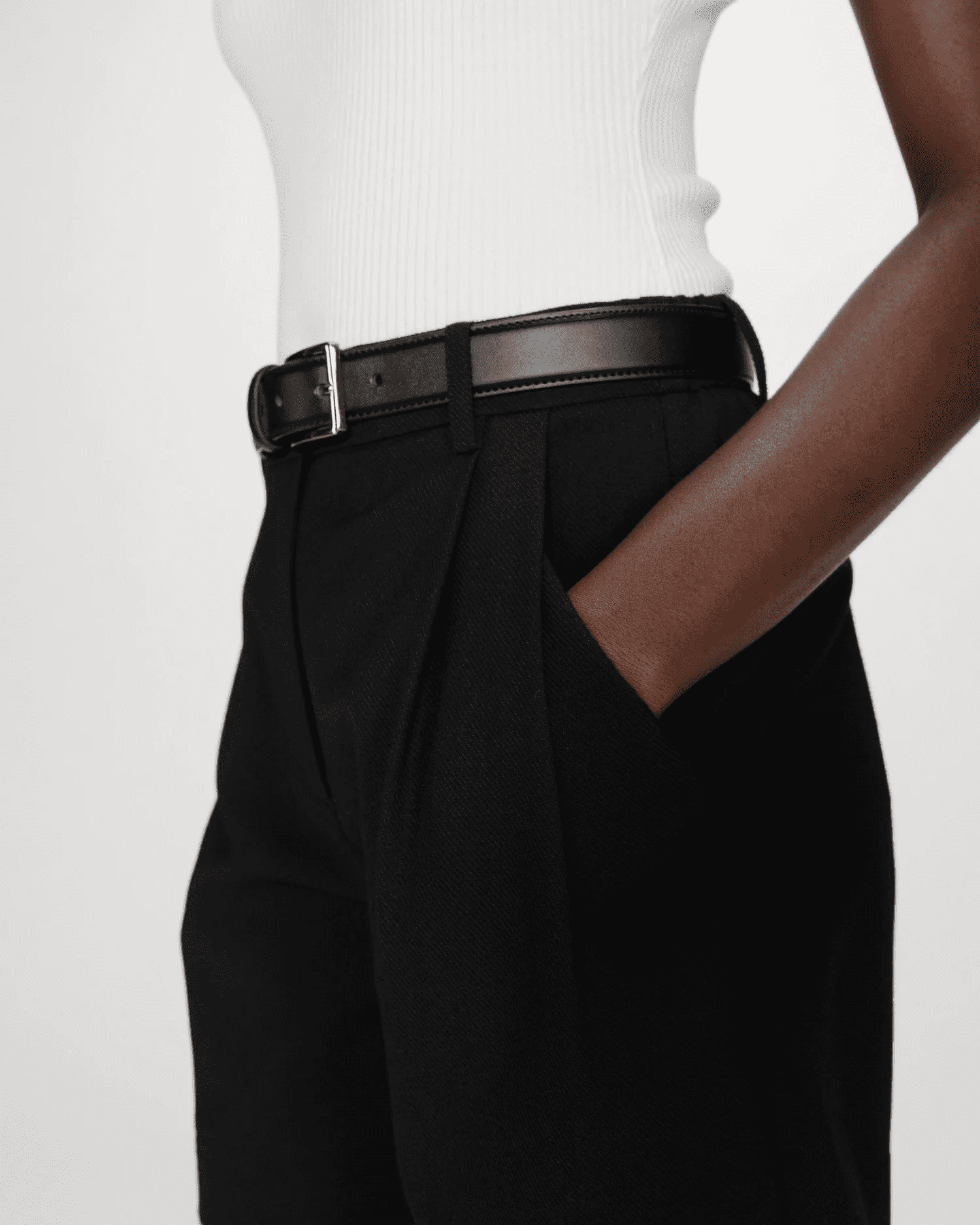 The crisp pleats, belt loops, and refined pockets create a sophisticated silhouette.