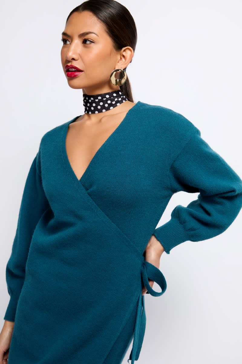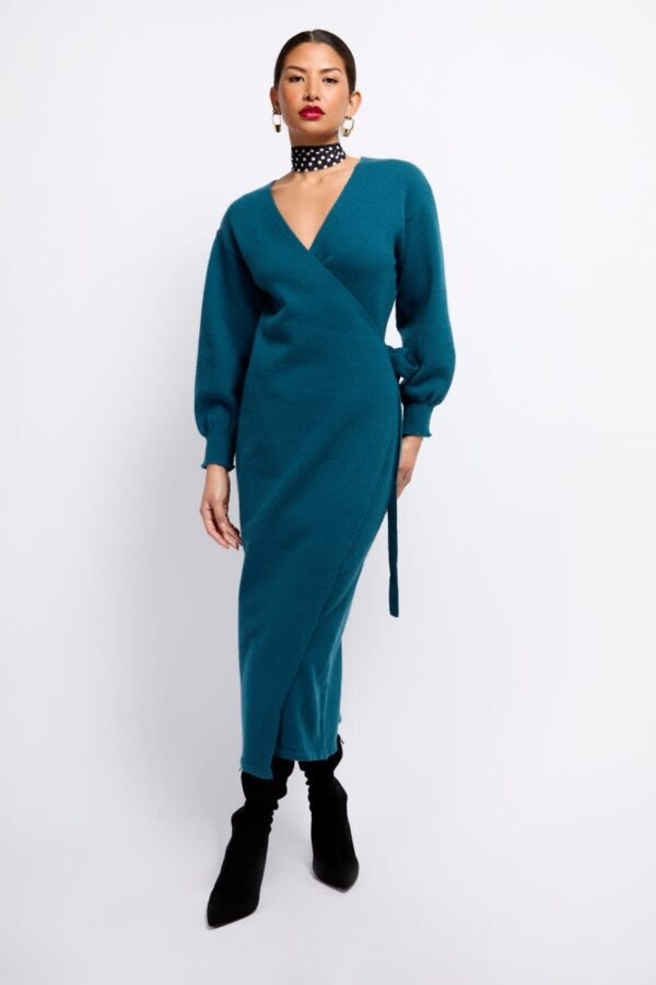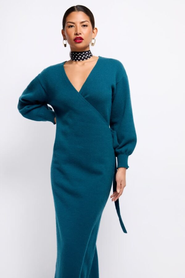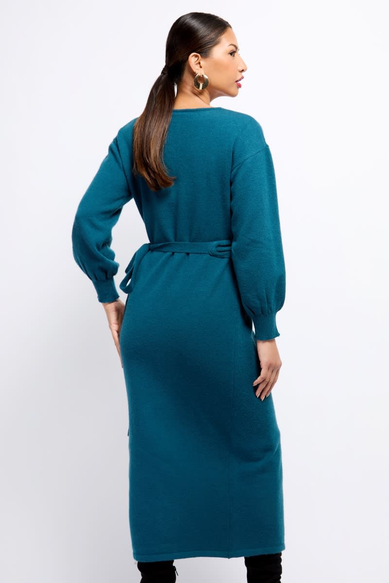 Petrol blue knit, midi wrap dress, with long sleeves.