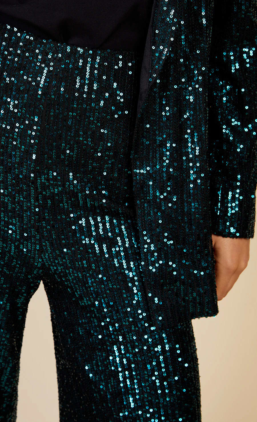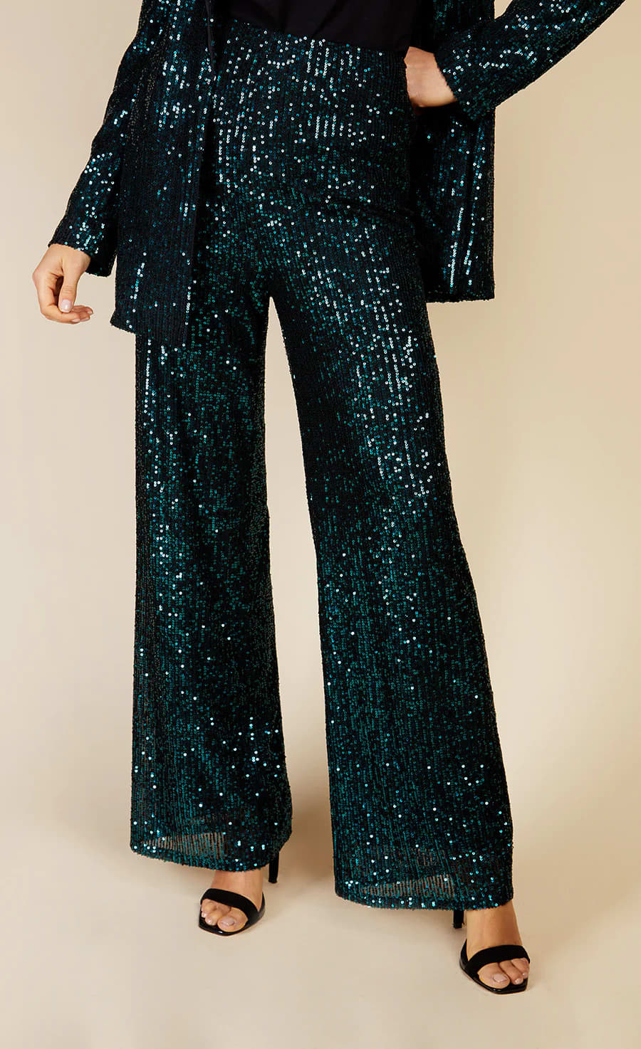 Look super sharp this season in these stunning all over sequin, high-waisted trousers. Crafted from all over sequin fabric, these flattering wide legged trousers are perfect for parties. Match with our green sequin blazer and block heels for a killer look.