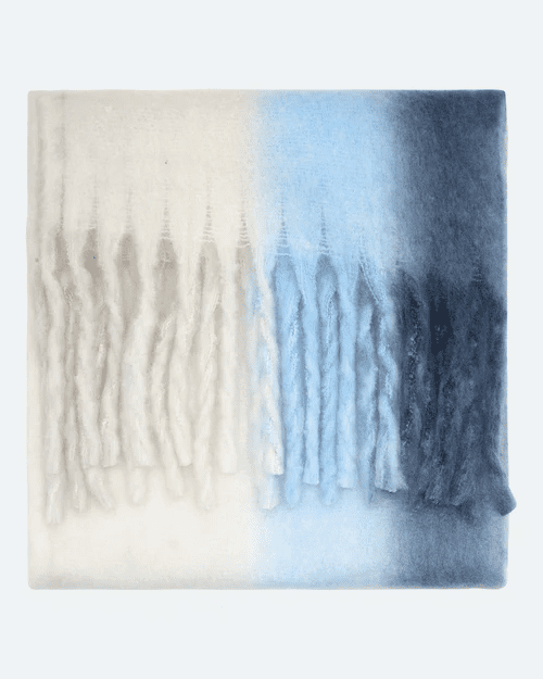 This large soft Winter scarf is the perfect accessory for the colder days. It features tassels and a beautiful blue stripe detail. It is so warm and cosy and would look great with jeans and a nice coat.