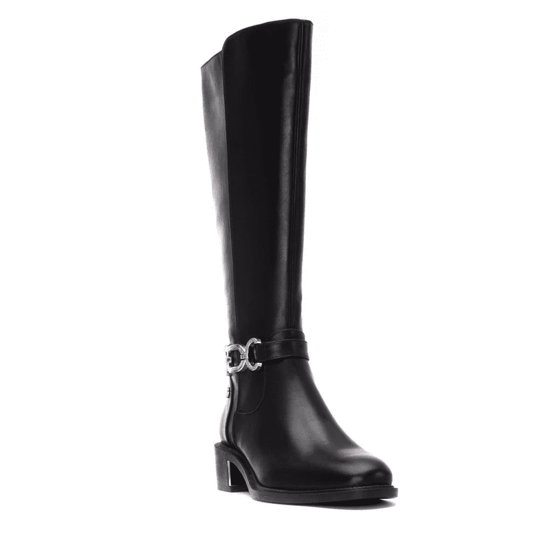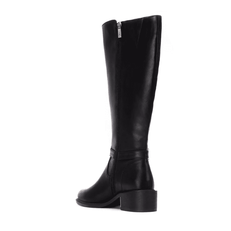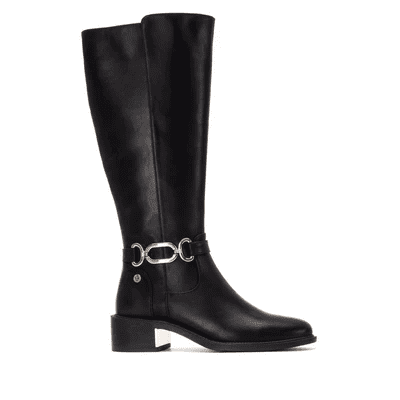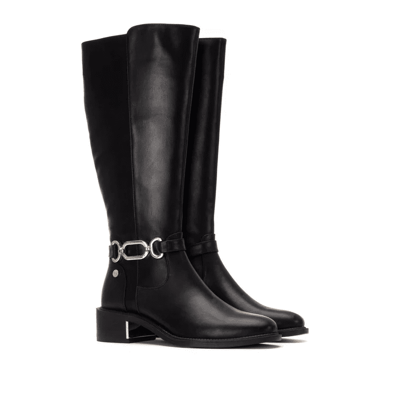 Classic vegan leather winter boot providing comfort & style! Side zipper closure. Knee boot with decorative gold metal buckle. Non-slip sole.