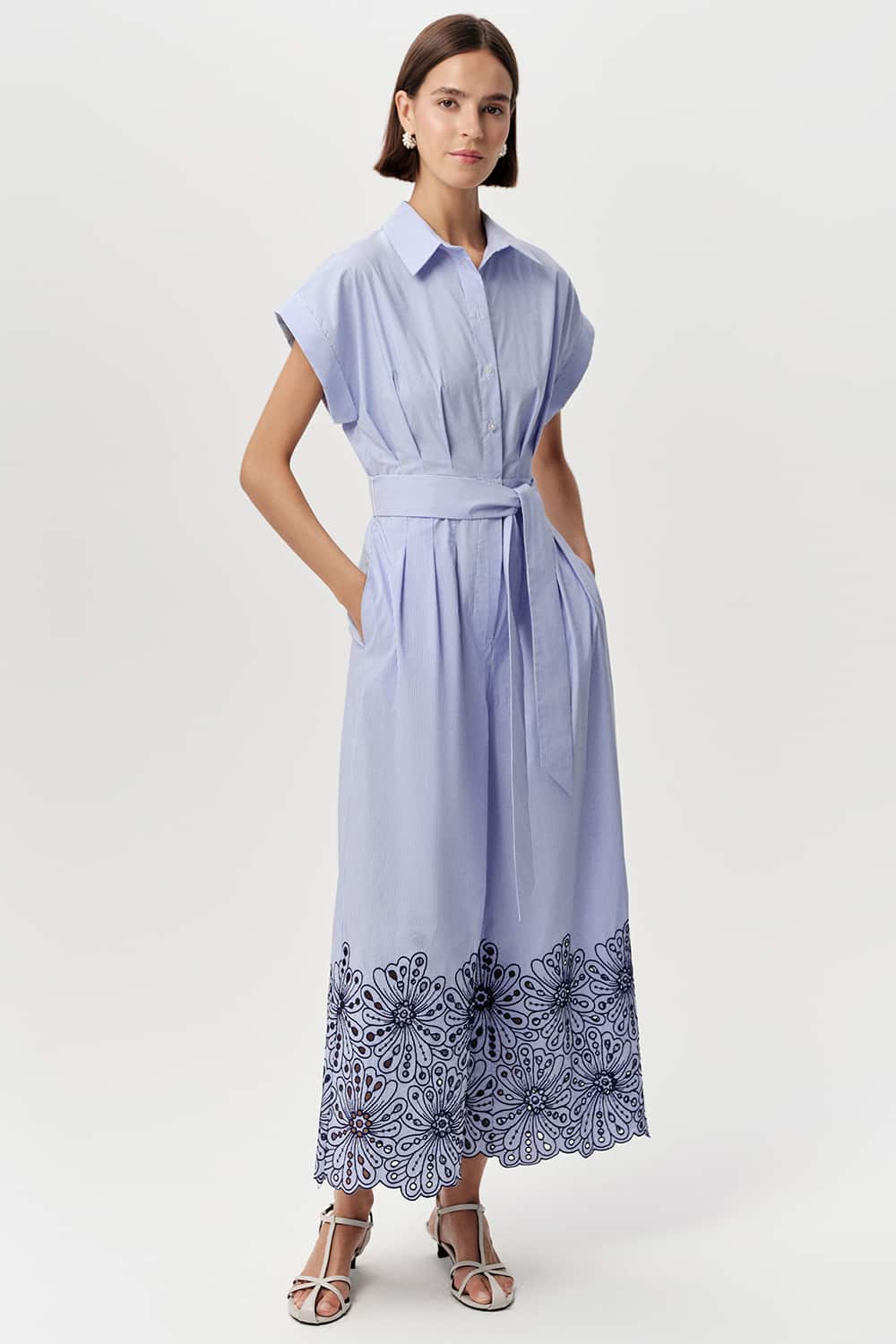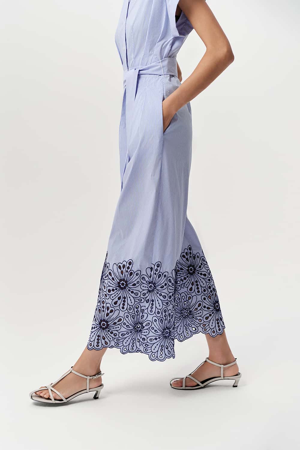 We adore this blue and white striped jumpsuit. It features a button down front and a collar with a beautiful pleating detail which gives a beautiful silhouette. The sleeves are short with turned up cuffs. It has a matching belt and a floral pattern on the bottoms of the wide legs in a navy colour embroidered with keyhole detailing throughout. This jumpsuit also has pockets so it ticks all the boxes. It also features a hidden zip and clasp to close.