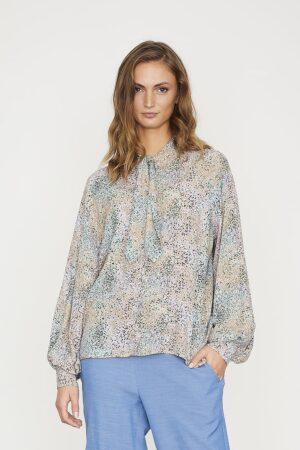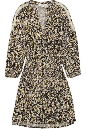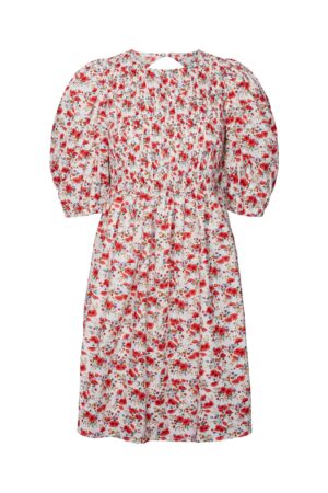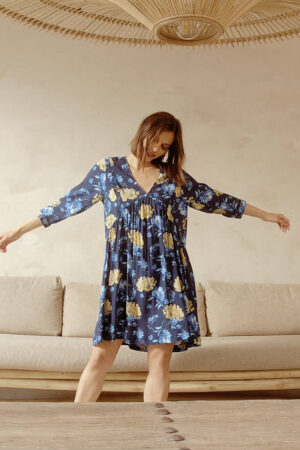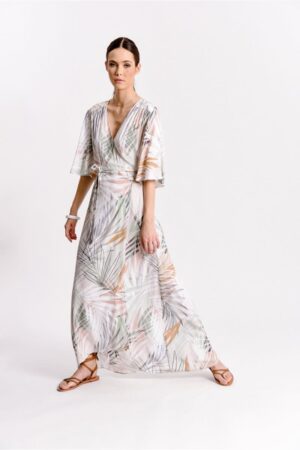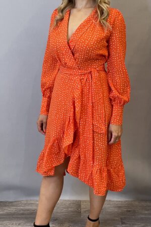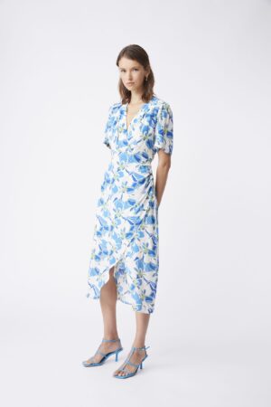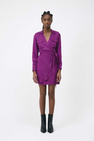 Jacquard fabric short wrap dress with tie close and long wide sleeves.