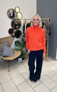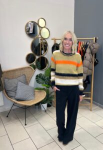 6:Beca stripe knit orange multi €59, Kate wide leg trouser black €59, Hansa long jacket black €125