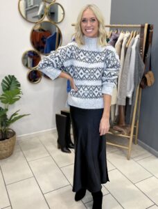 8: Minnie Fairisle Knit €135 Black Skyler skirt €85 Sofie Suede Boot €255